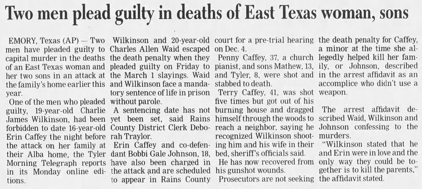 In the early morning hours of March 1, 2008, Charlie Wilkinson and his friend, Charles Waid, entered the Caffey residence. Erin Caffey and Bobbi Johnson, Waid’s girlfriend, sat outside in the getaway car with full knowledge of what would happen inside. Erin had promised Charlie’s friend, Waid, money if he would help with the killings.