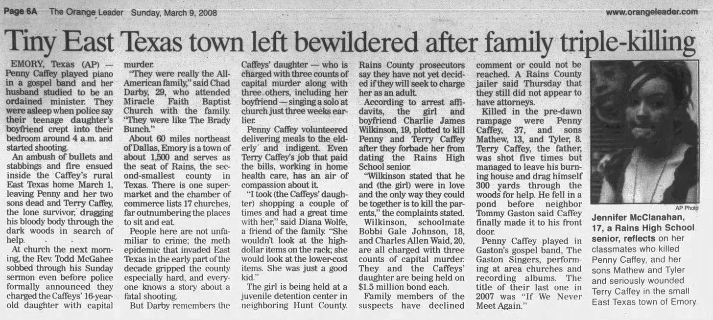 Terry was a youth pastor. Erin was active in youth events and sang in the church choir. Penny played the church piano, while brothers Matthew and Tyler played guitar and harmonica. By all appearances, they were a loving family, with the Caffey’s doing their best to give their children a good life.