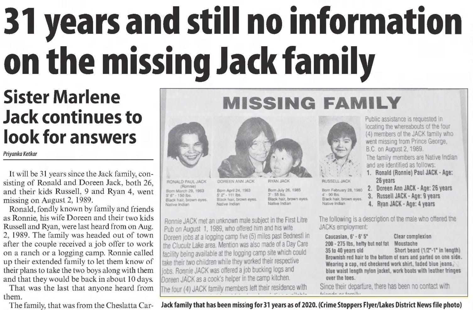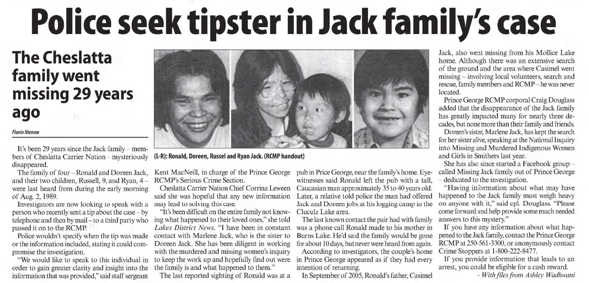Nielsen, Mark, “Mystery remains around disappearance of Jack family”, Sep 10, 2019 https://www.princegeorgecitizen.com/local-news/mystery-remains-around-disappearance-of-jack-family-3737801