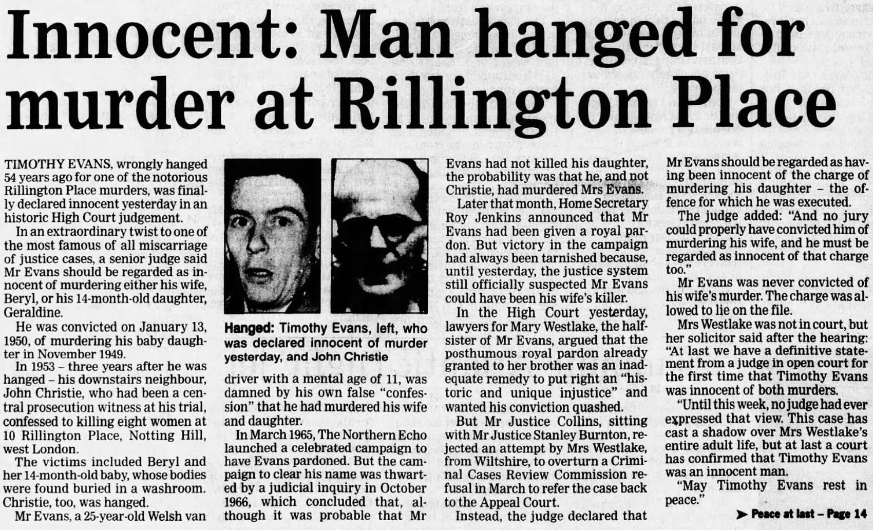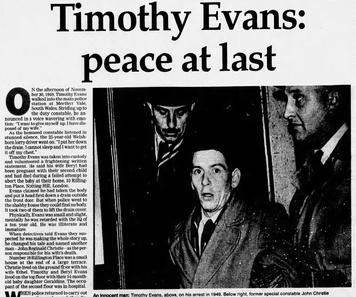 The case of Timothy Evans became one of the defining legal scandals of 20th-century Britain. It contributed directly to the growing unease around the death penalty and helped prompt its abolition in 1969.