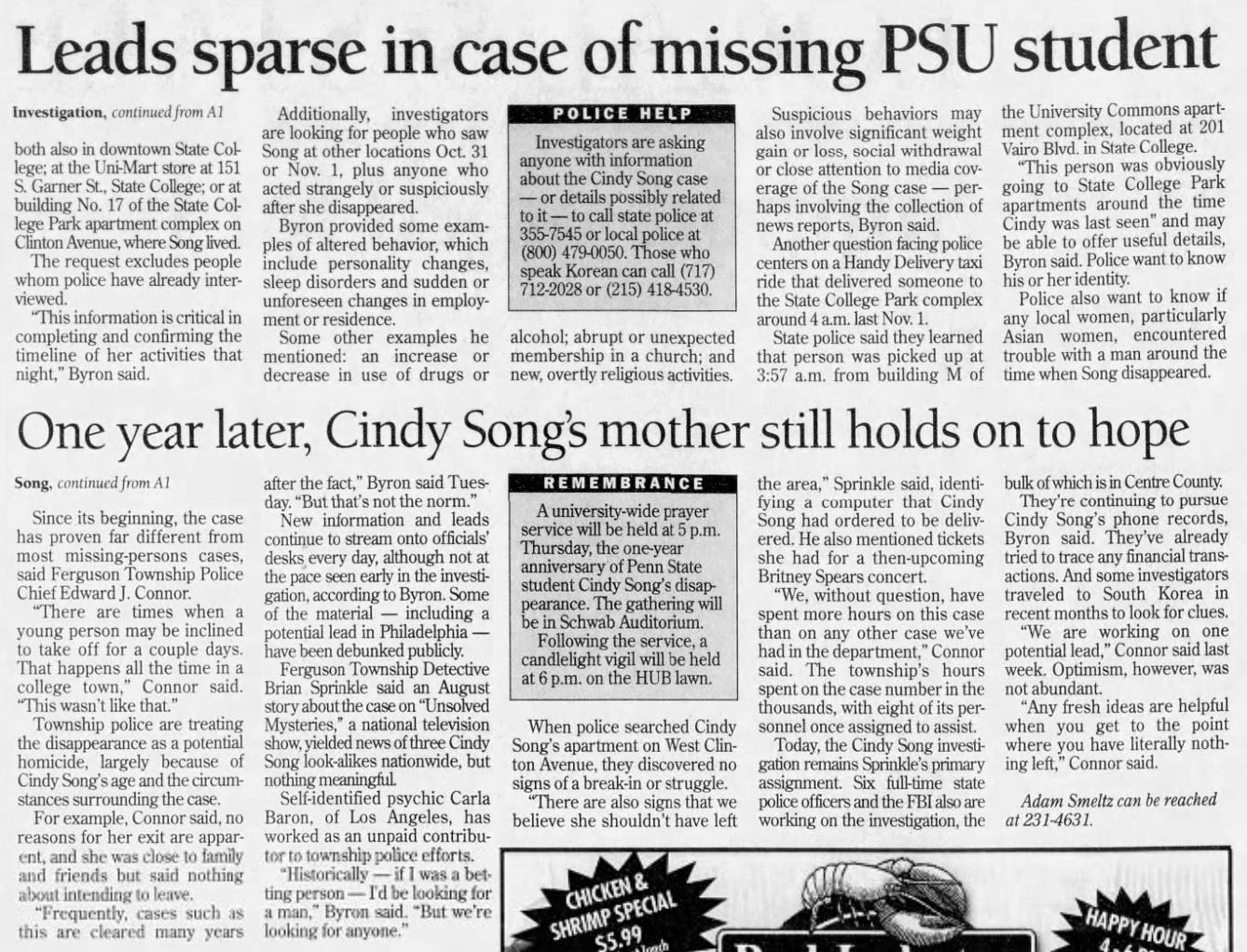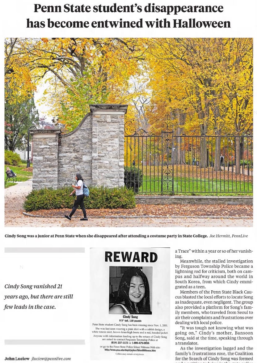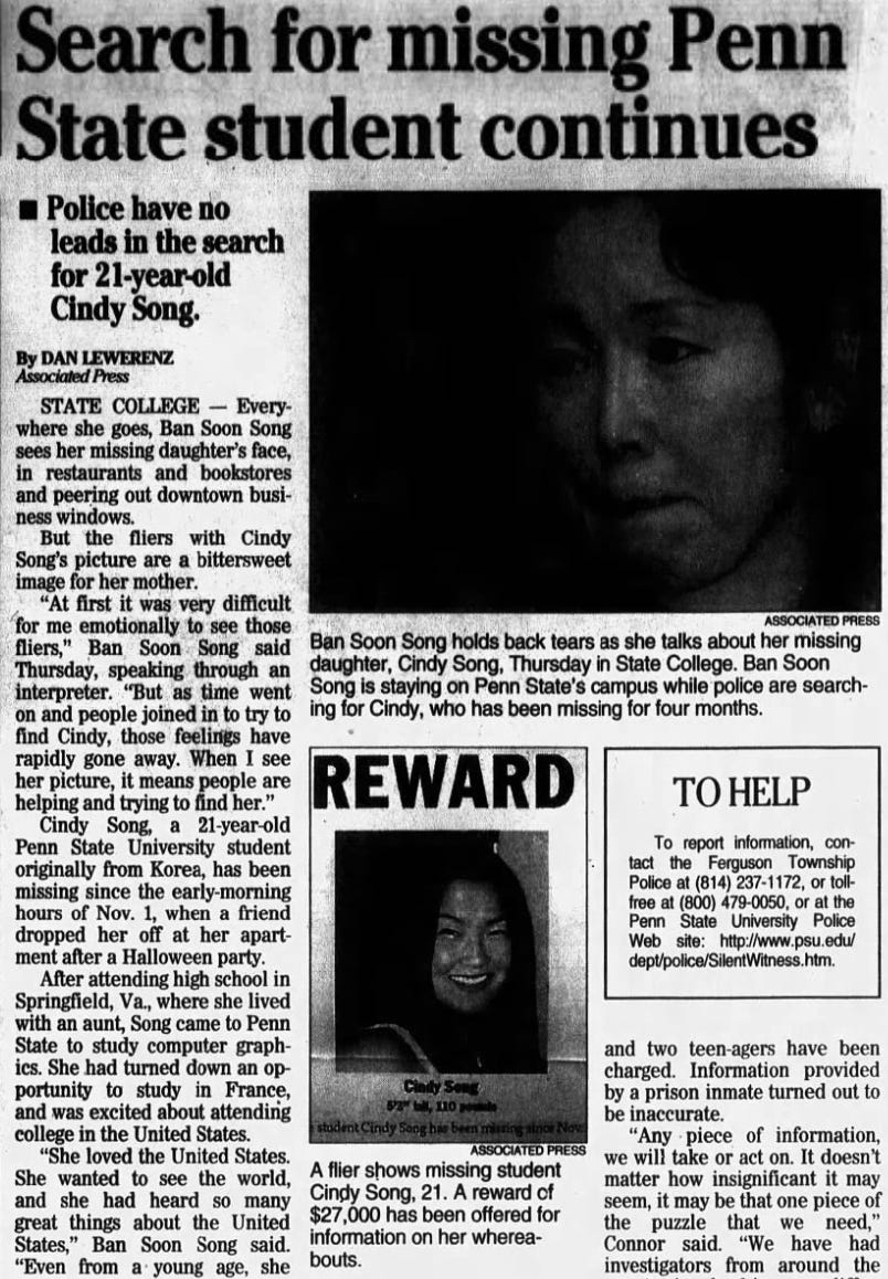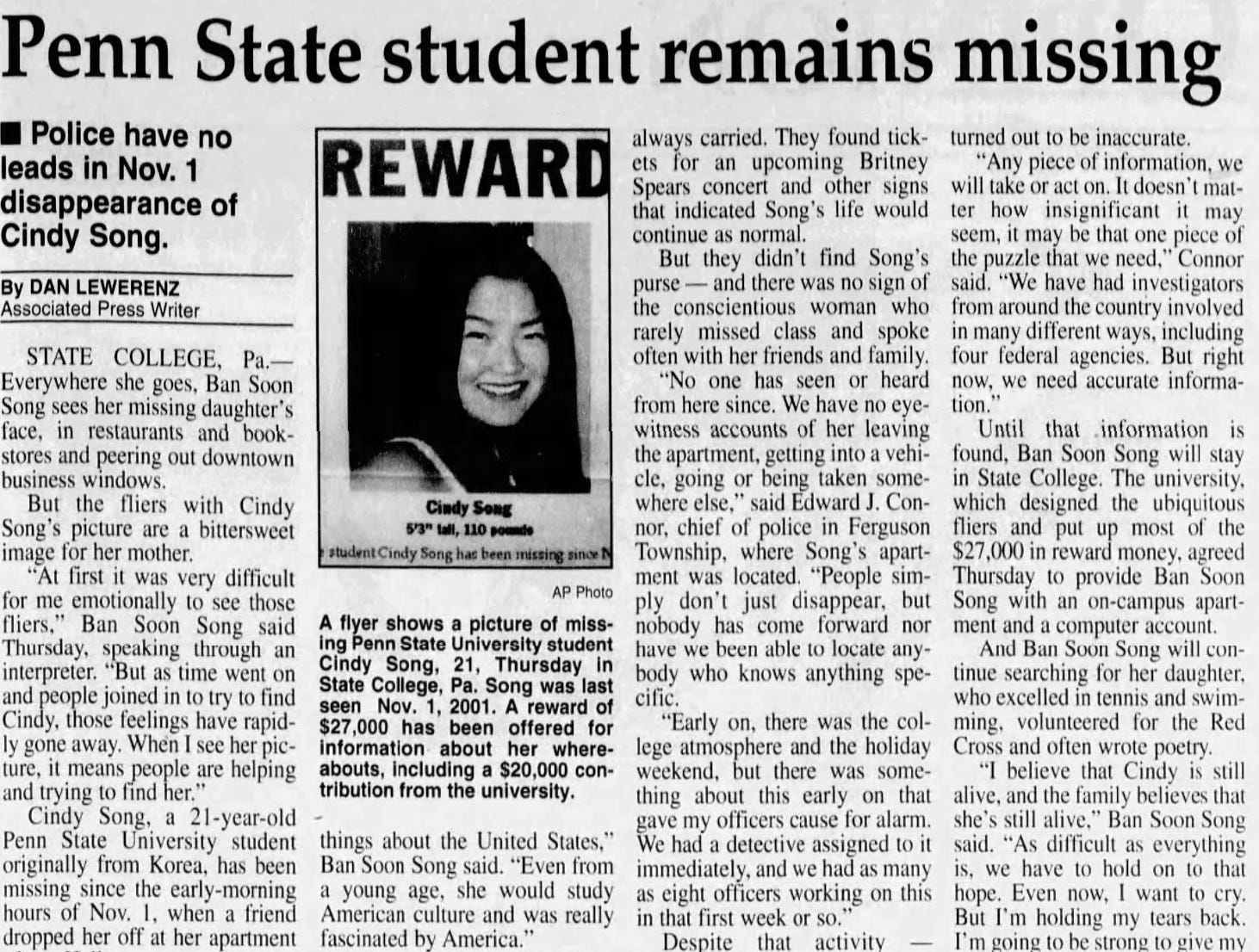 Engel, James. “‘A light should burn’ | 21 years on, Penn State student Cindy Song remains missing.” The Daily Collegian, 17 January 2022, https://www.psucollegian.com/features/a-light-should-burn-21-years-on-penn-state-student-cindy-song-remains-missing/article