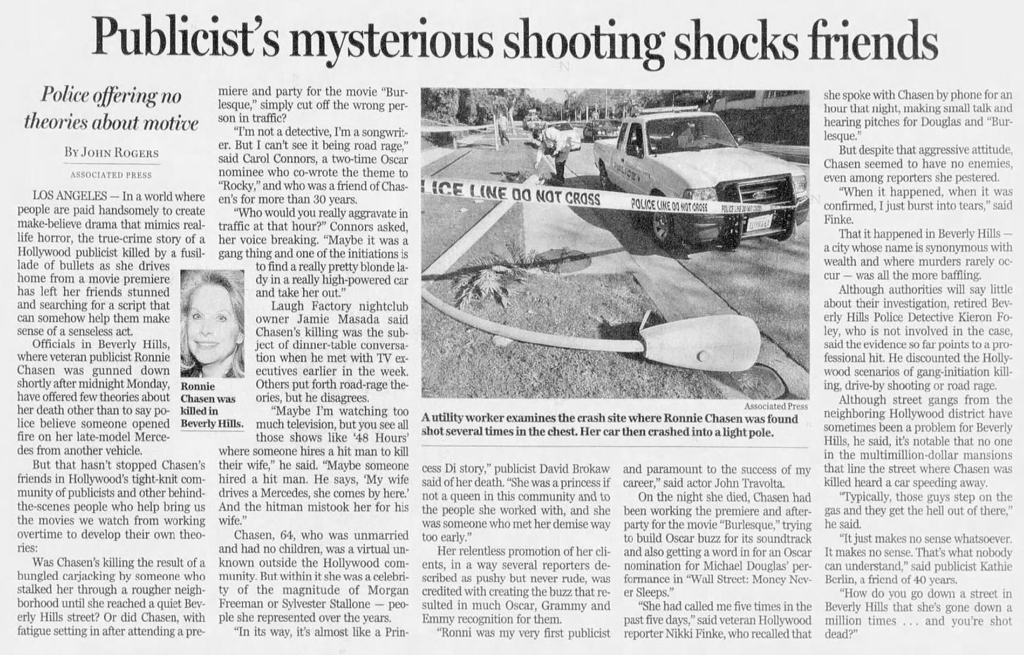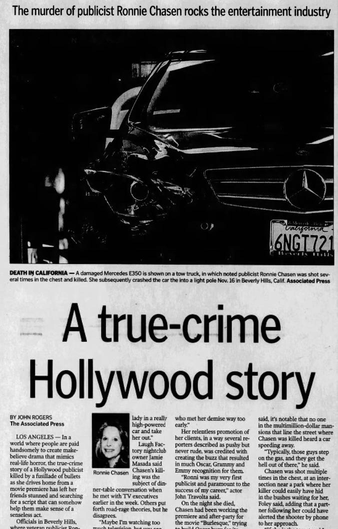 In November 2010, acclaimed celebrity publicist Ronni Chasen was shot and killed in Beverly Hills while returning from a movie premiere. Though the case was officially closed, many questions remain