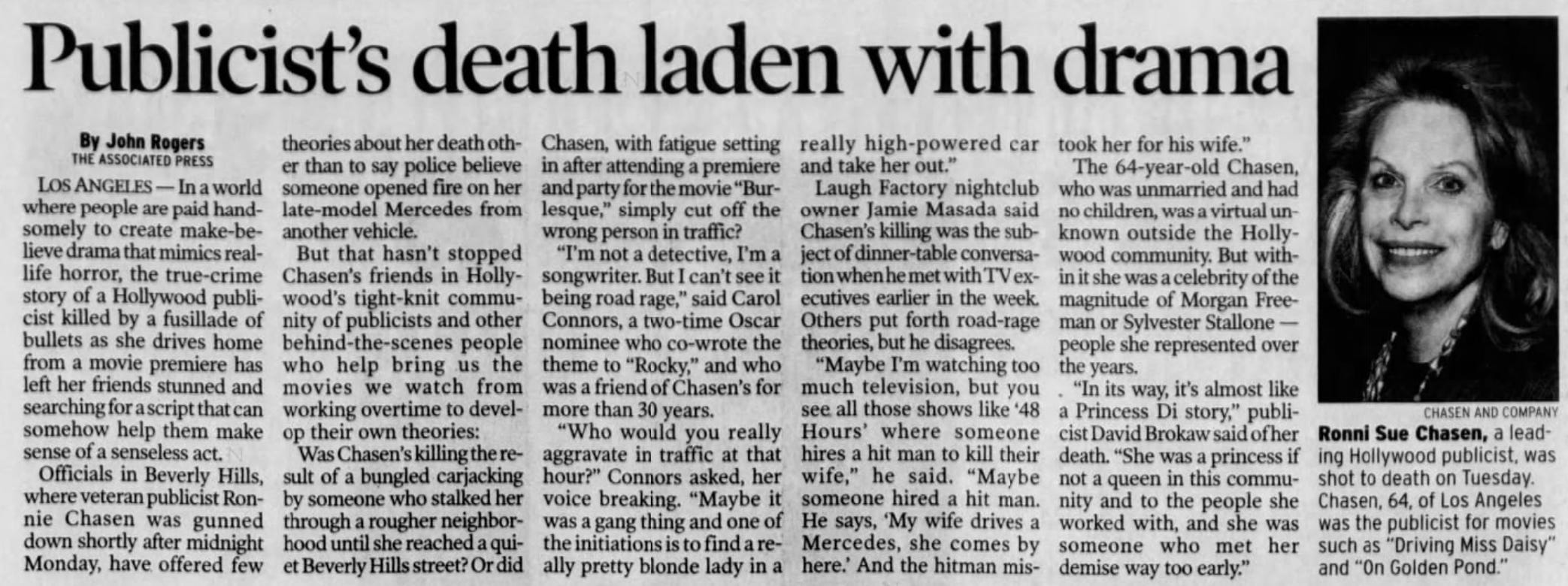 Baum, Gary. “What Really Happened the Night Hollywood Power Publicist Ronni Chasen Was Killed?” The Hollywood Reporter, 17 Apr. 2023, https://www.hollywoodreporter.com/movies/movie-features/what-happened-night-hollywood-power-publicist-ronni-chasen-was-killed-947580/
