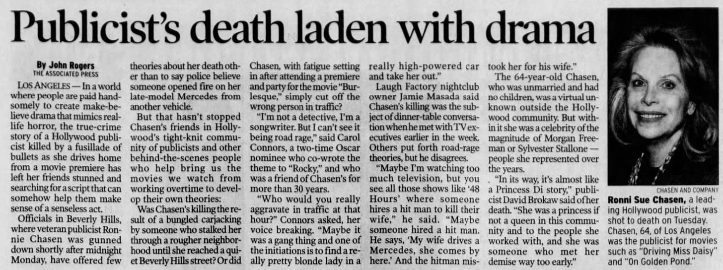 In the aftermath of Ronni Chasen’s death, those left behind struggled to make sense of it. Nobody could understand why someone would murder her on her way home from a premiere. Rumors began to circulate about potential gambling debts, shady art deals, and potentially fraudulent film financing.