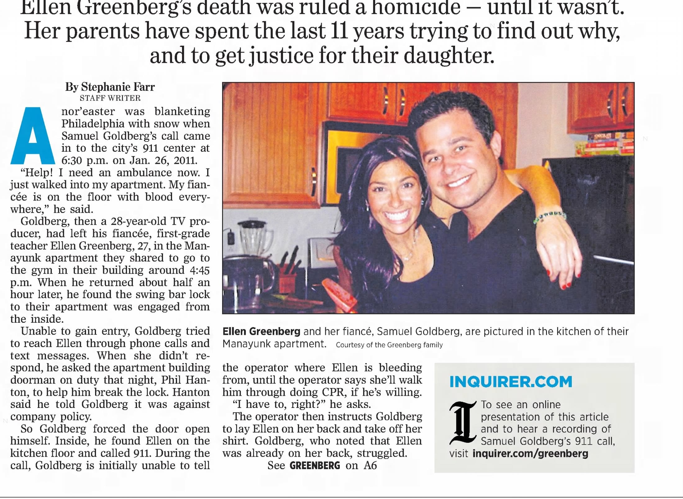 Shortly after 27-year-old Ellen Greenberg was found brutally stabbed to death in her Philadelphia apartment, her death was ruled a homicide. Yet months later, it was unexplainably changed to suicide
