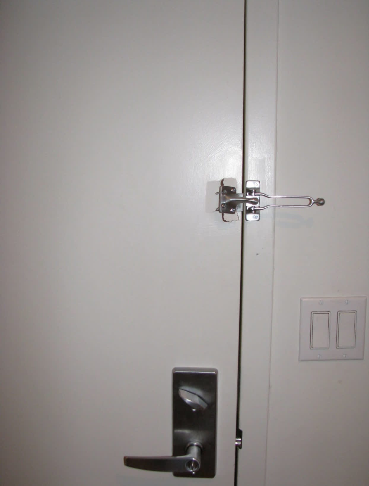 Sam further explained that the door is locked from the inside- these apartments had both a standard lock, which Sam could open using his key, and a latch lock, like the ones seen in many hotel rooms. Sam said the latch was engaged from the inside, and he was unable to enter the unit as he could not reach his fiancée.