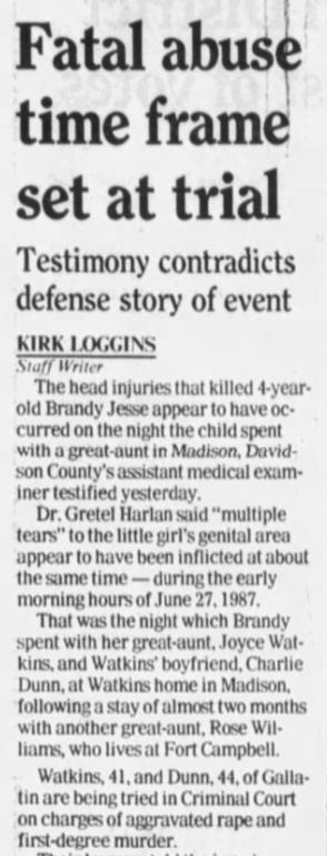 There, doctors found that Brandi was unconscious and suffering from severe head trauma and vaginal injuries. She was intubated and transferred to Vanderbilt University Medical Center. The medical team worked hard to try to save her, but sadly, she died the following day, June 28, 1987.