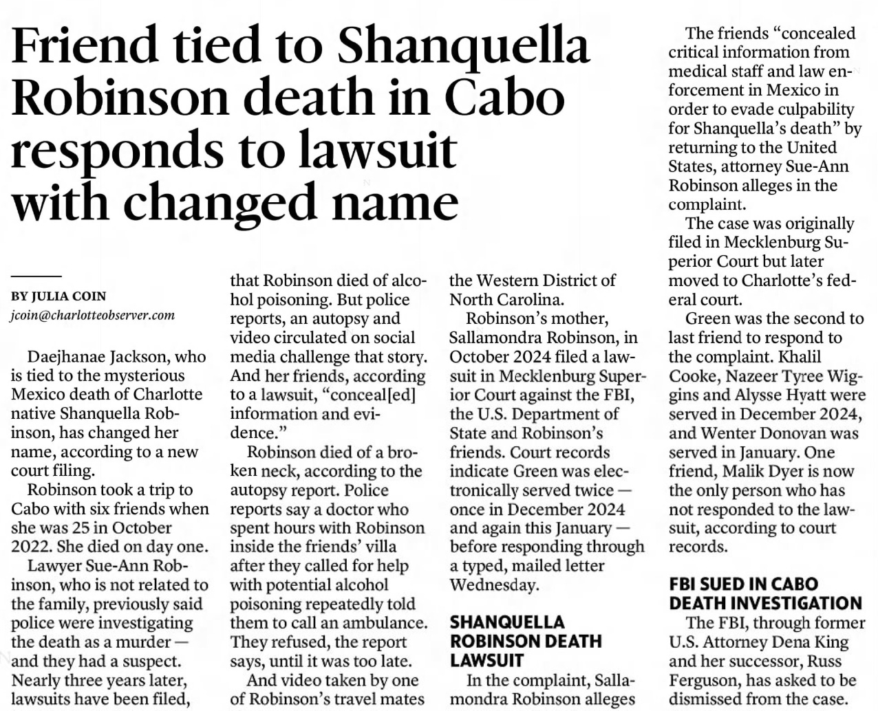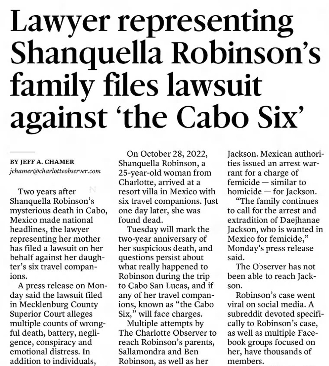 On October 25, 2024, nearly two years after Shanquella’s tragic death, her mother, Sallamondra Robinson, filed a wrongful-death lawsuit in Mecklenburg County Superior Court in Charlotte. The lawsuit names each of the six people who traveled with her (widely referred to online as the “Cabo Six”) and also includes the U.S. State Department and the FBI as defendants.