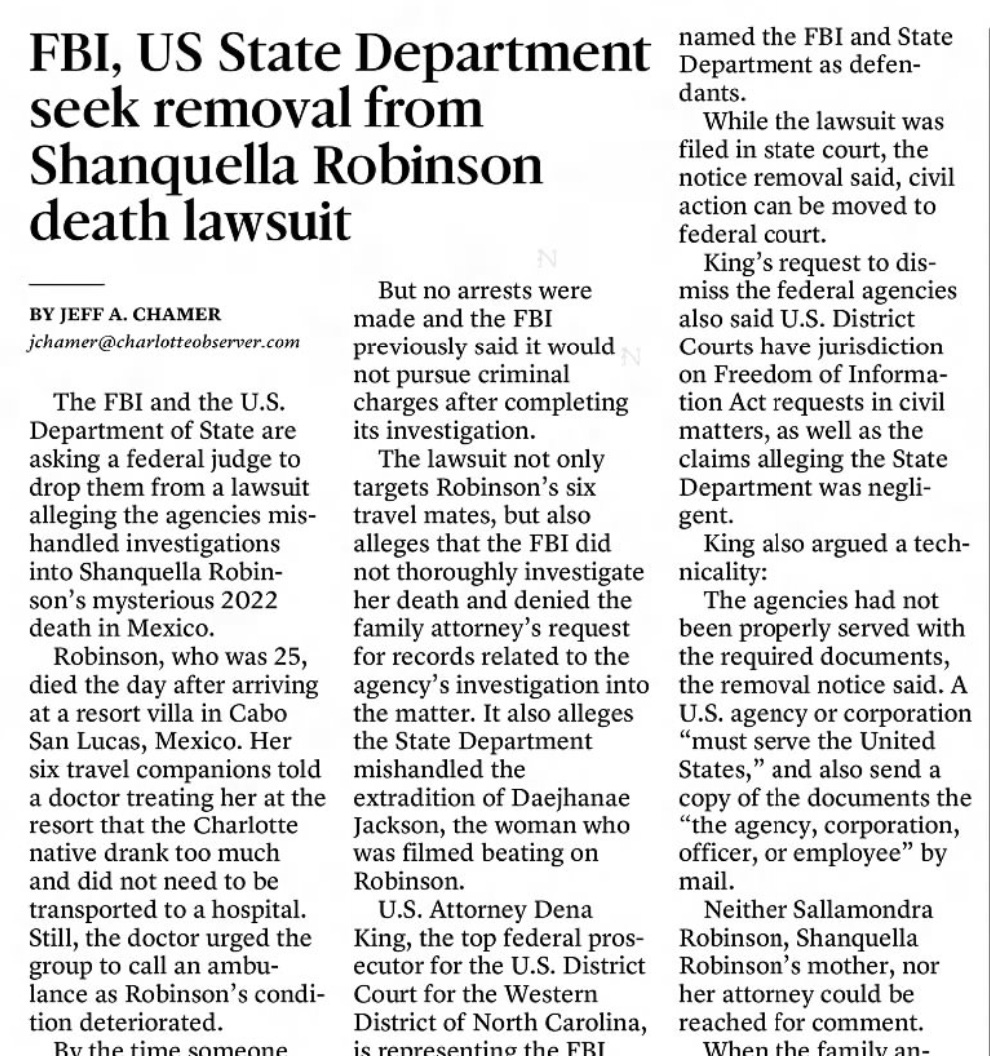 Lomis, Spencer Chrisman and Connor. “Judge Partially Dismisses Shanquella Robinson Lawsuit Filed against FBI, State Department.” WBTV3, 13 June 2025, https://www.wbtv.com/2025/06/13/judge-partially-dismisses-shanquella-robinson-lawsuit-filed-against-fbi-state-department/