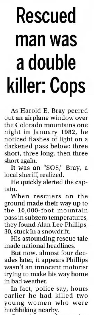 DiFiore, Elena and LaRosa Paul, “Authorities unknowingly rescued man from snowdrift after he killed 2 women near Breckenridge, Colorado”, August 27, 2023, 2023https://www.cbsnews.com/news/annette-schnee-bobbie-jo-oberholtzer-1982-cold-case-murders-alan-lee-phillips-rescued-breckenridge-colorado