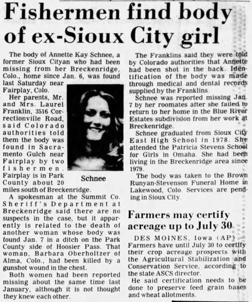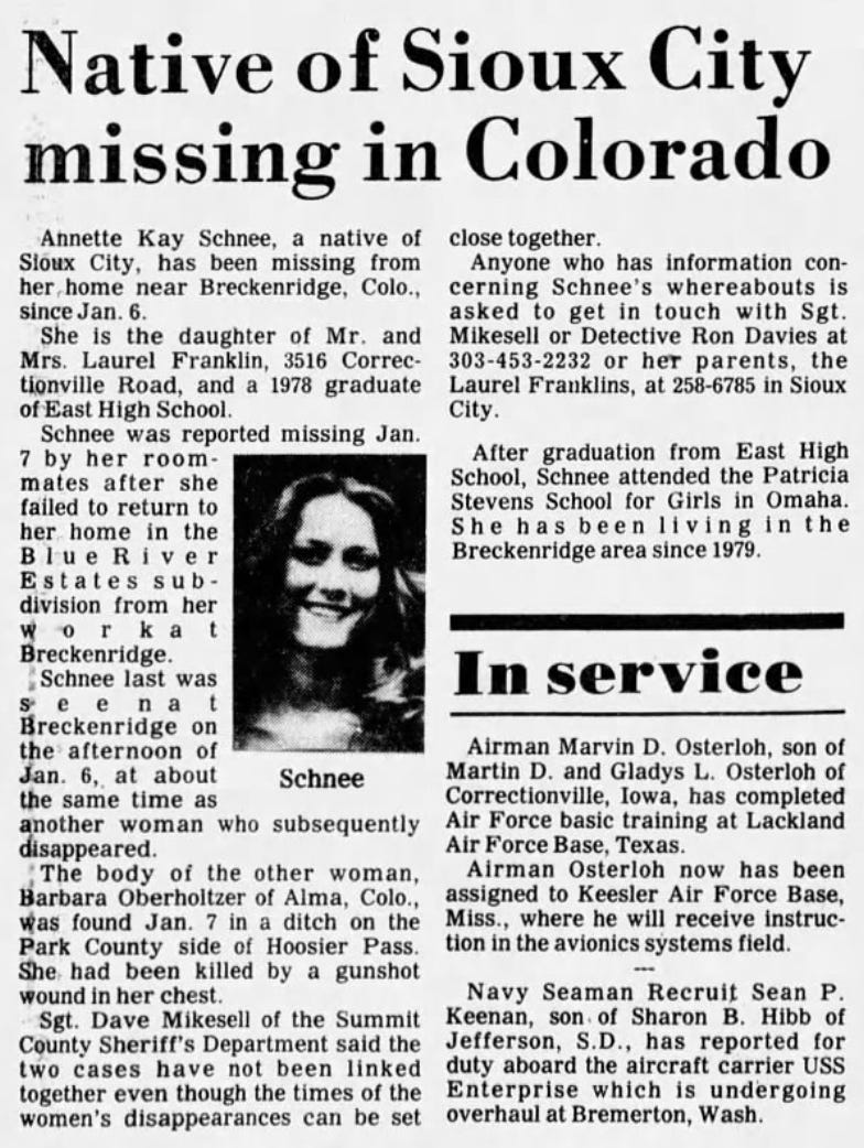 Twenty-one-year-old Annette Schnee had moved to the Breckenridge area, hoping to find work and start a new chapter in her life. She planned to become a flight attendant. Annette worked two jobs in nearby Frisco, Colorado, at a Holiday Inn hotel during the day and as a waitress in the evenings.