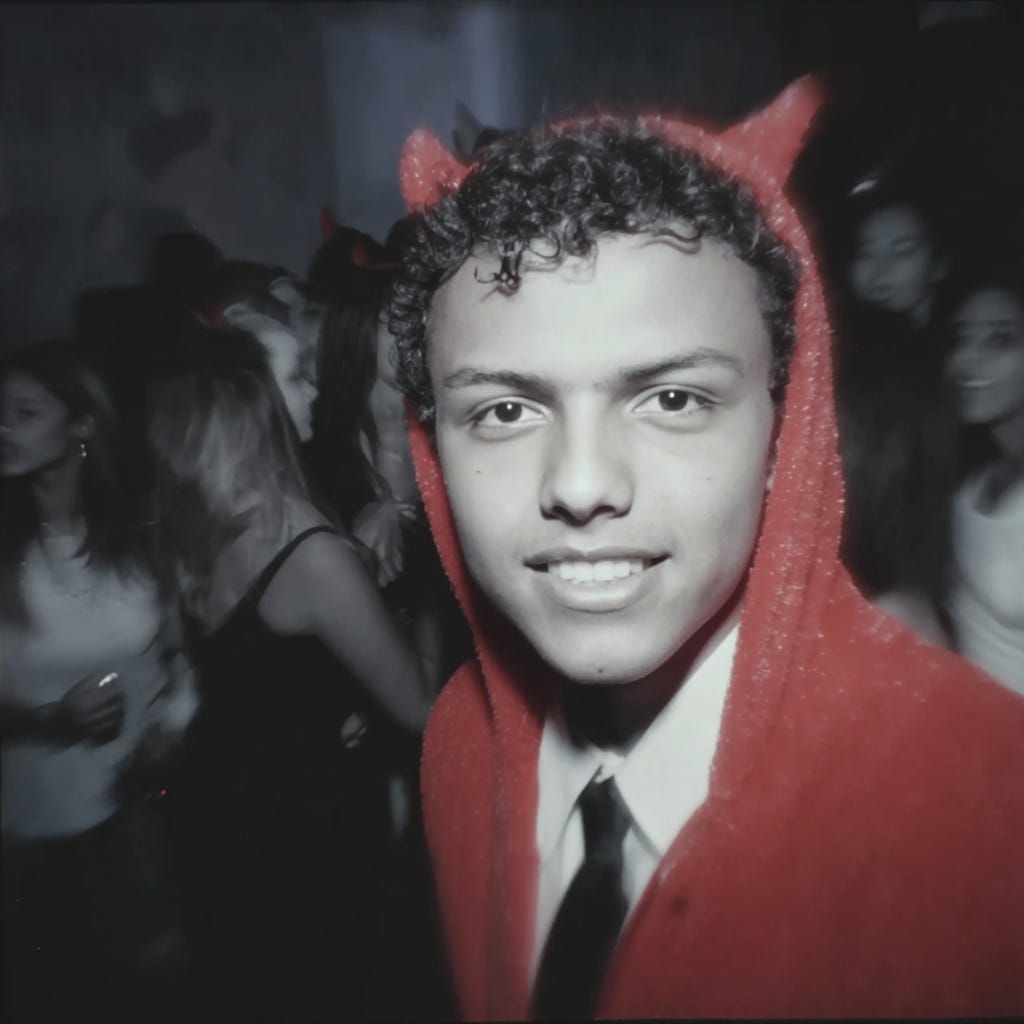 Luis was accompanied by Laura Moreno, his date that night, their friend Jessy Quintero, and several classmates. Luis was wearing a red devil costume that evening and seemed to be enjoying himself with the group.