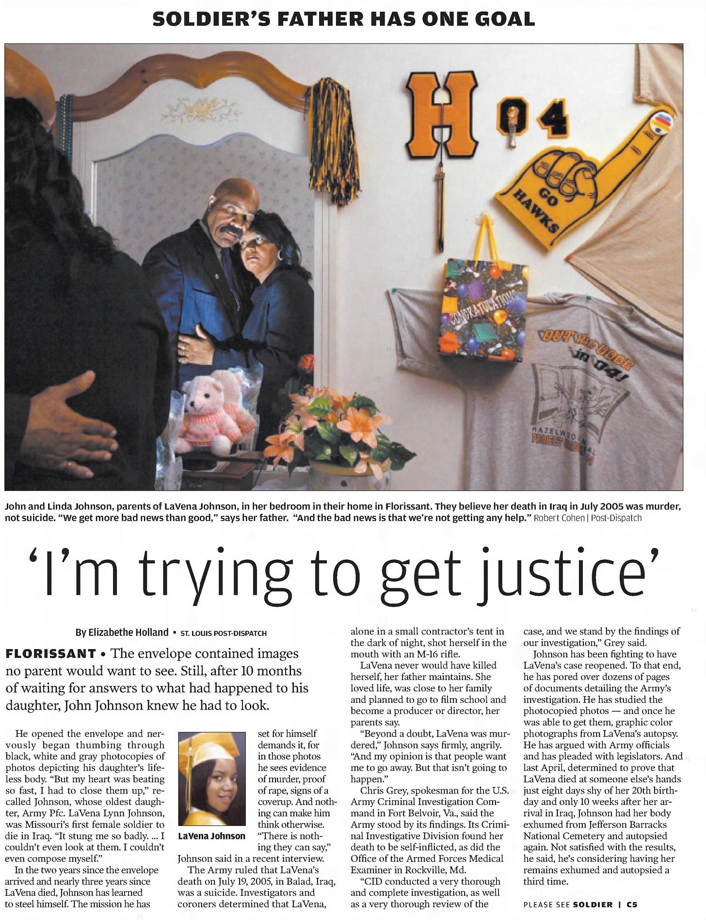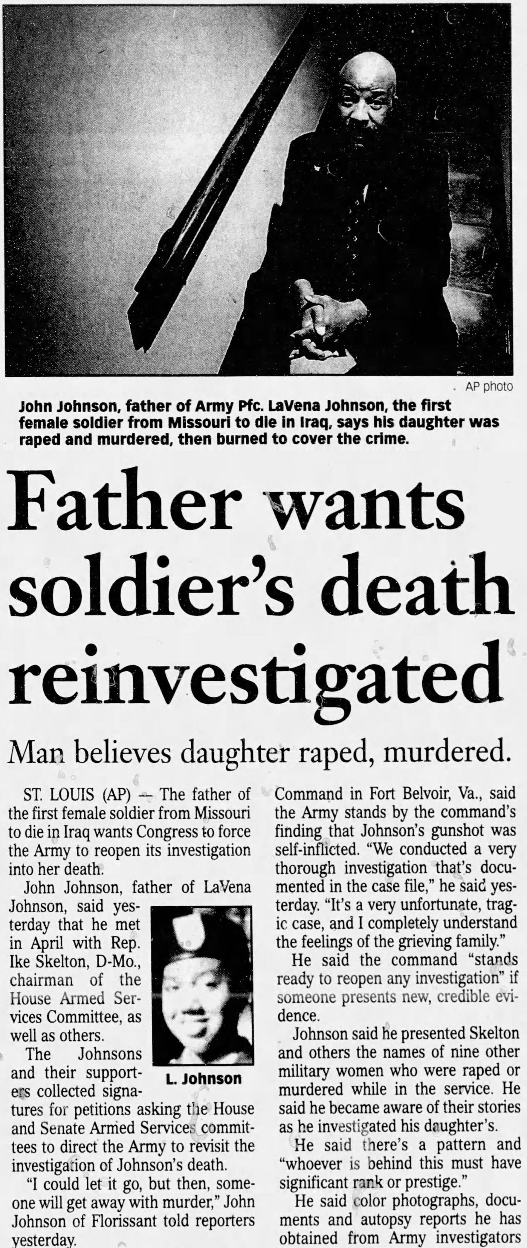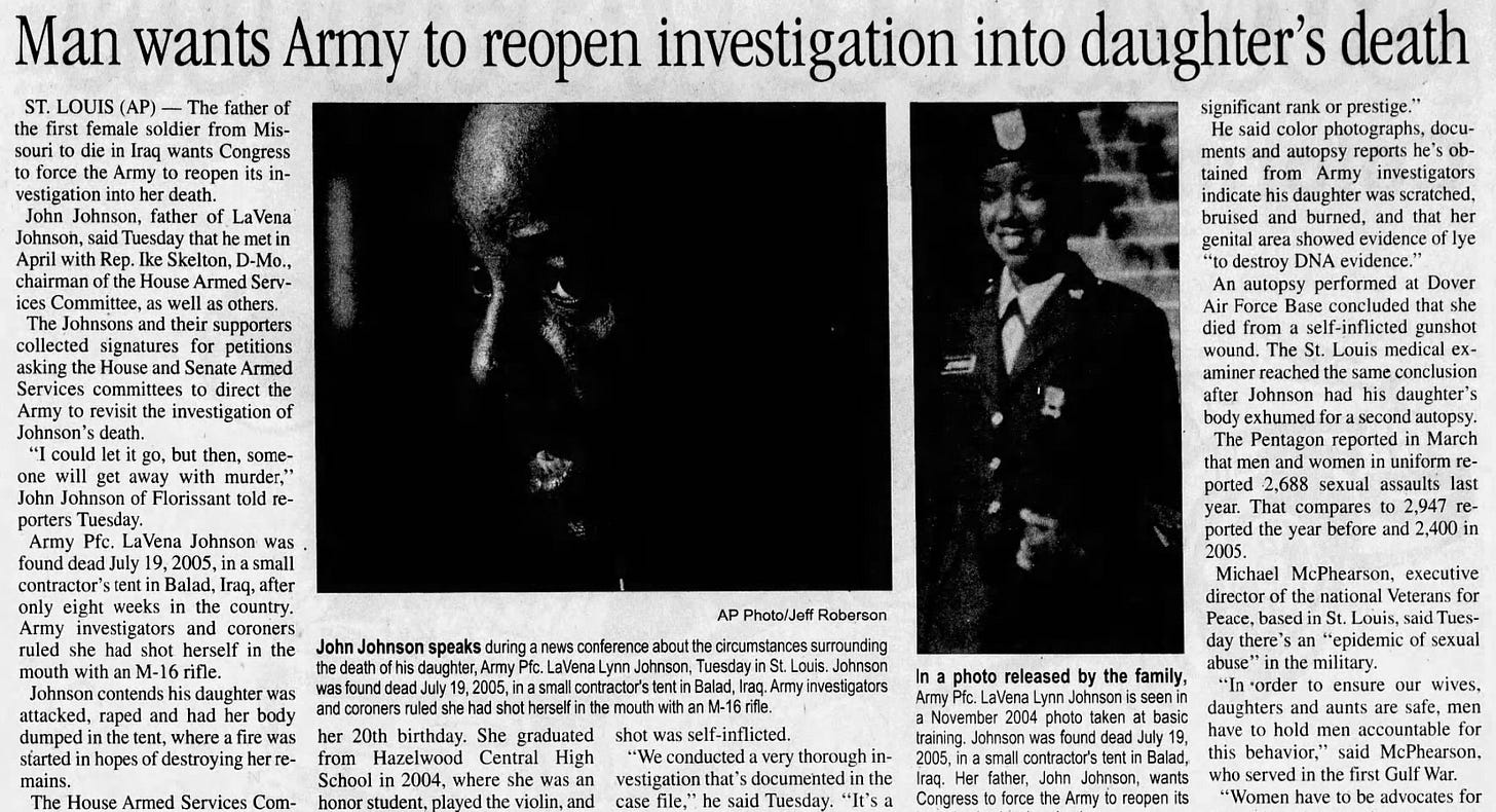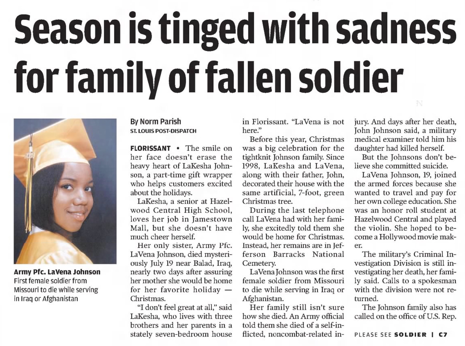 Early in the morning of July 19th, 2005, the parents of 19-year-old LaVena Johnson were visited by representatives of the United States Army. What they were told was both shocking and unfathomable. According to the Staff Sergeant, LaVena had taken her own life with a self-inflicted gunshot wound. The official statement from the Army corroborated this story.