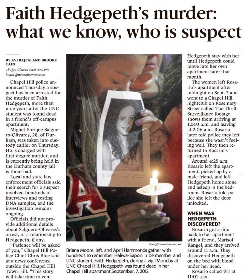 The DNA was later matched to 28-year-old Miguel Enrique Salguero-Olivares, who was arrested in Raleigh on unrelated DUI charges a few weeks prior. In September 2021, nearly a decade after Faith was murdered, an arrest was finally made.