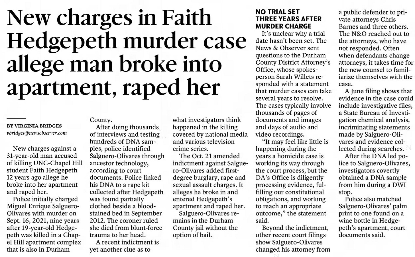 Now, four years later, Miguel Enrique Salguero-Olivares awaits trial, charged with the first-degree murder of Faith Hedgepeth. In November 2024, the indictment against Salguero-Olivares was expanded to include charges of first-degree burglary, first-degree rape, and first-degree sexual offense.