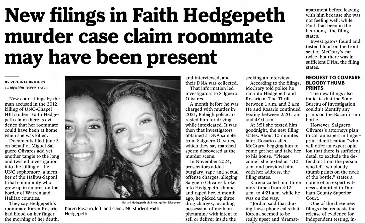 Casey, Monica. “New Motions in Faith Hedgepeth Case Mention Roommate Had Blood on Finger.” WRAL, 10 July 2025, wral.com/news/local/faith-hedgepeth-motions-witness-dna-allegations-july-2025/.