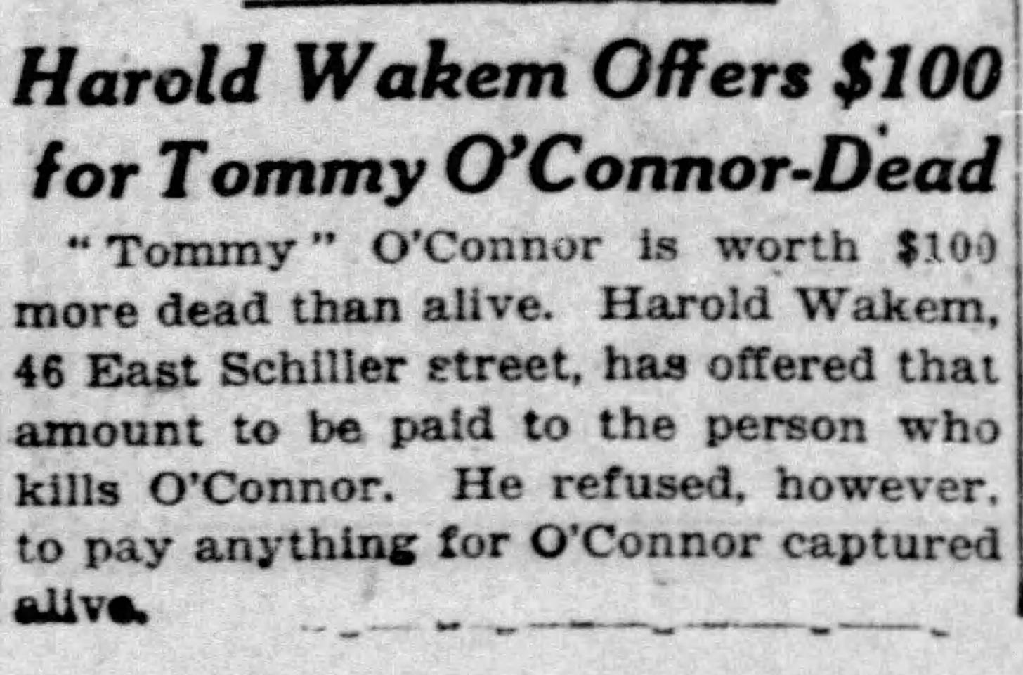 Chicago’s police chief Fitzmorris offered a $500 reward for Tommy O’Connor, dead or alive, while another Chicago citizen offered $100 for O’Connor - dead only.