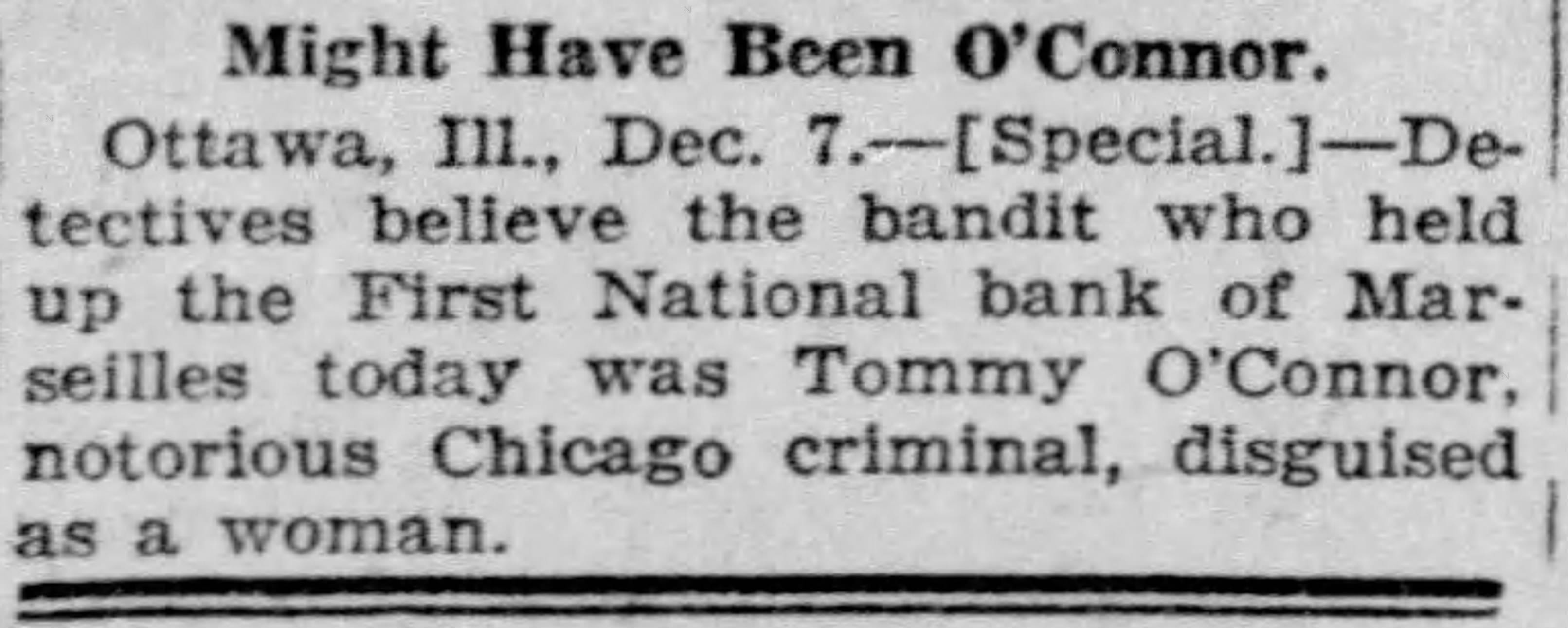 A 1922 article identified him as the bandit who attempted to hold up a train in Iowa. A 1924 article had him hiding out in the Wisconsin woods. A 1926 article claimed he was the lone survivor of a group of bandits who were killed by sheriffs in Los Angeles. However, police in Chicago reported that they had not heard anything to that effect. Another 1926 article had O’Connor robbing a bank in Marseilles, Illinois, while disguised as a woman.