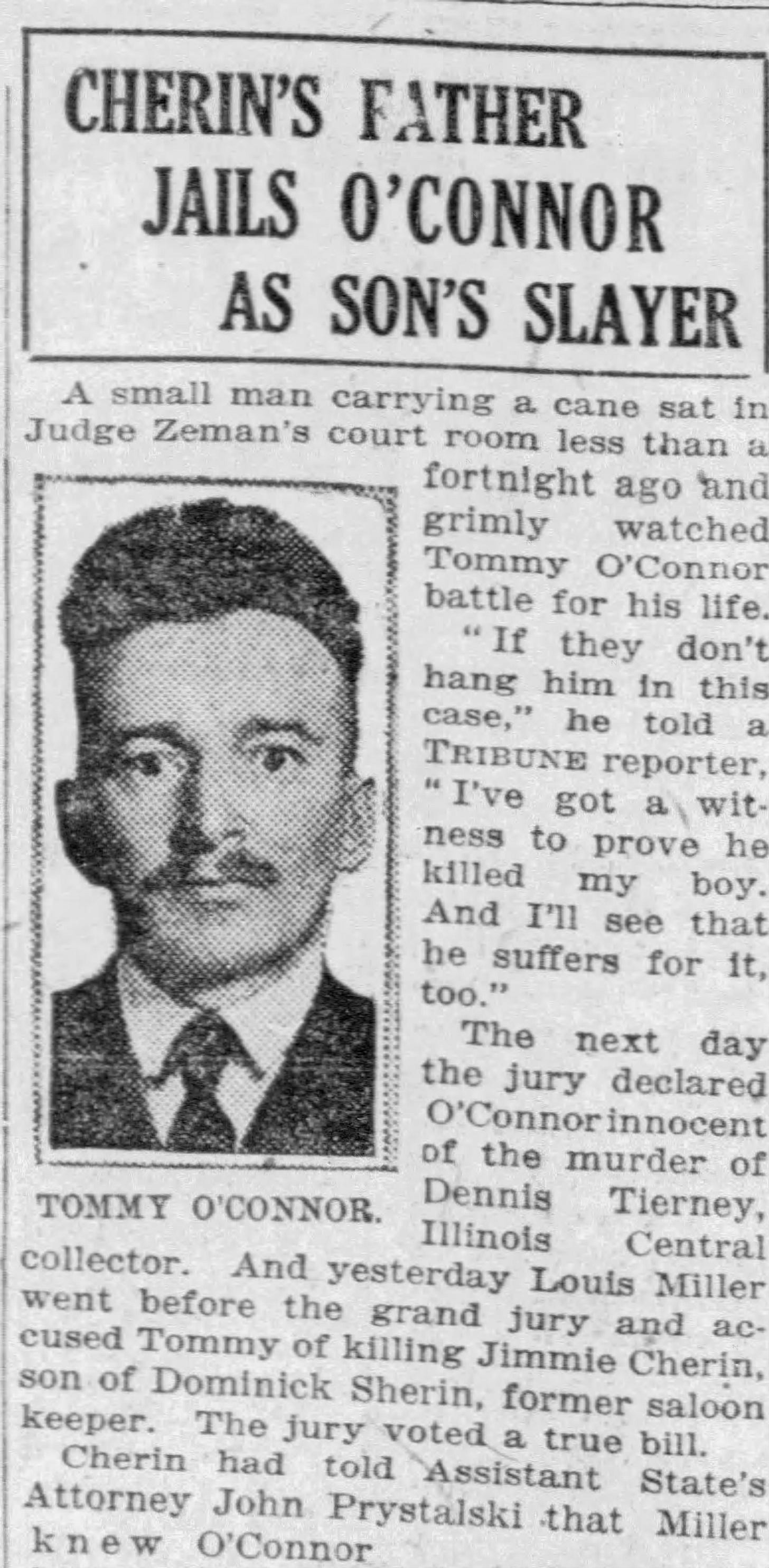 “Cherin’s Father Jails O’Connor As Son’s Slayer.” Chicago Tribune, 21 April 1920, https://www.newspapers.com/image/349491096/?match=1&terms=%20tommy%20o%27connor