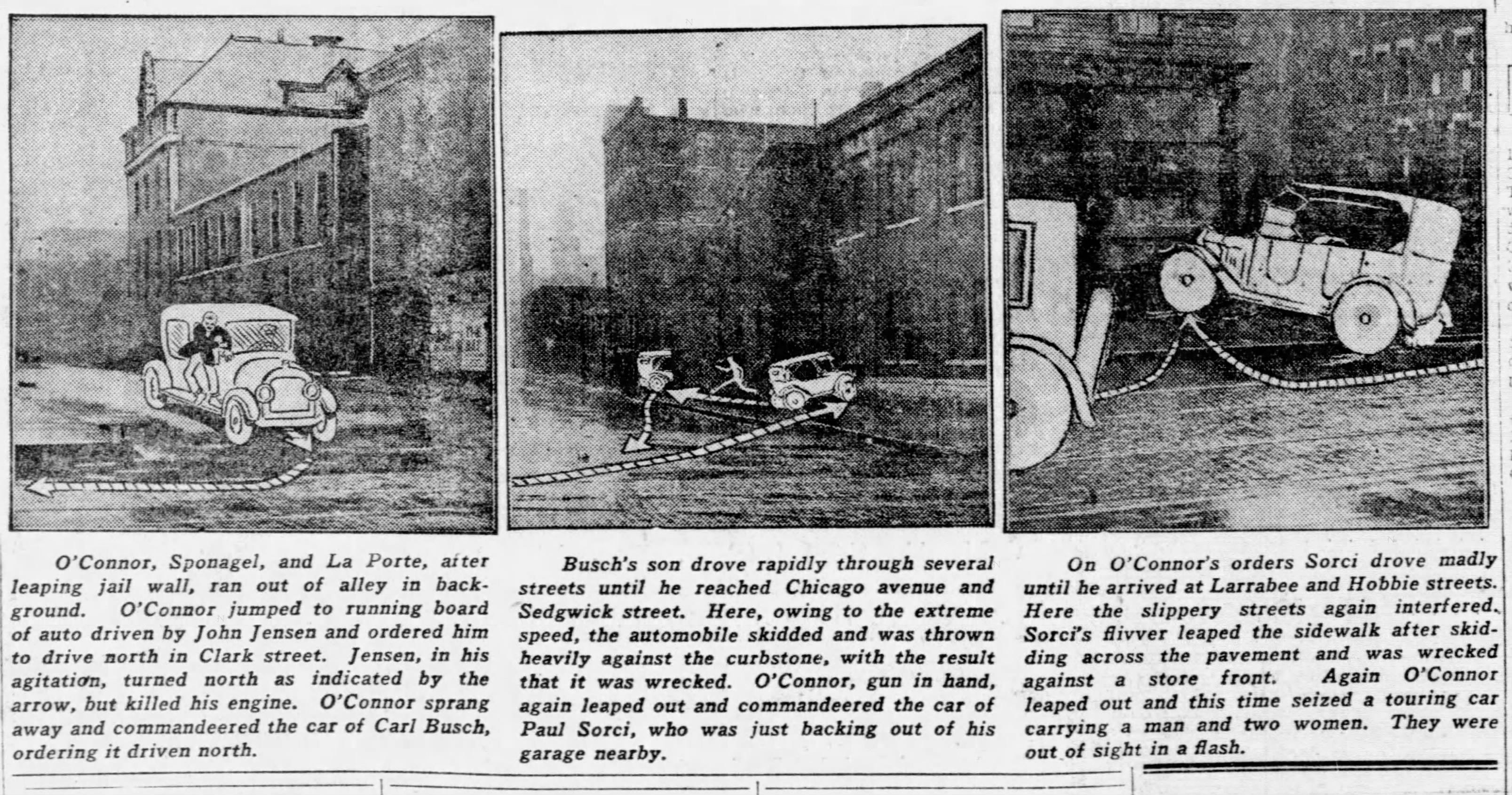 After several blocks, he exited the cab and carjacked a couple after jumping onto the running board of their car. Brandishing two revolvers, O’Connor forced the couple to drive north before ordering the wife to exit the car. After crossing through several suburbs, O’Connor then forced the husband out of the car before driving off.