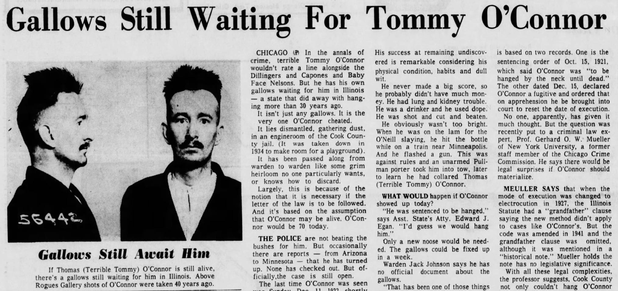 “Tommy O’Connor Breaks Jail on Eve of Hanging.” Chicago Tribune, 12 December 1921, https://www.newspapers.com/image/355172765/?match=1&terms=tommy%20o%27connor