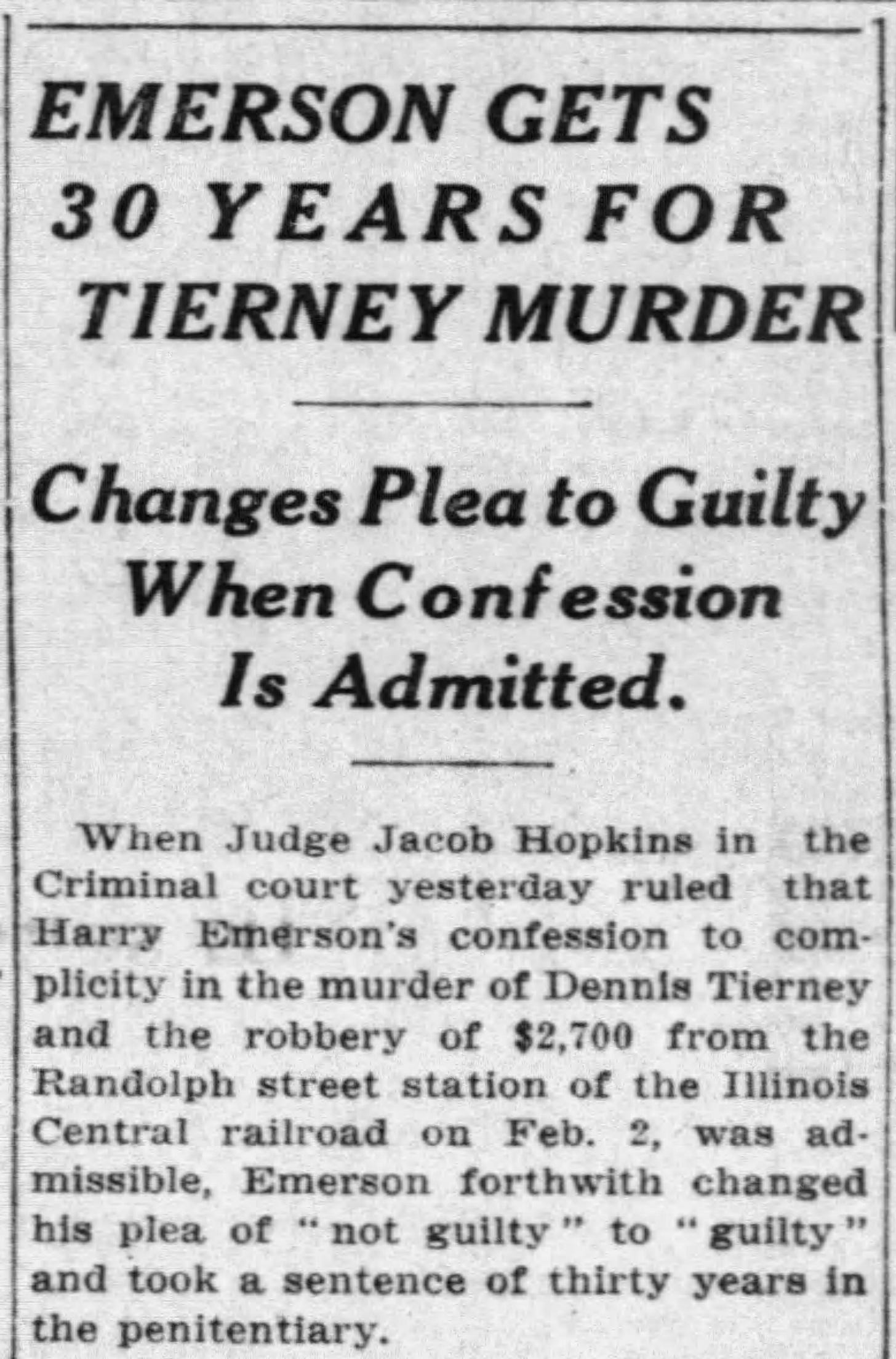 In July 1918, Emerson, fearing a possible death sentence, withdrew his plea of not guilty after the judge ruled that his confession could be admitted into evidence. Instead, he entered a plea of guilty for his role in the murder of Dennis Tierney. He was given a sentence of 30 years in prison.