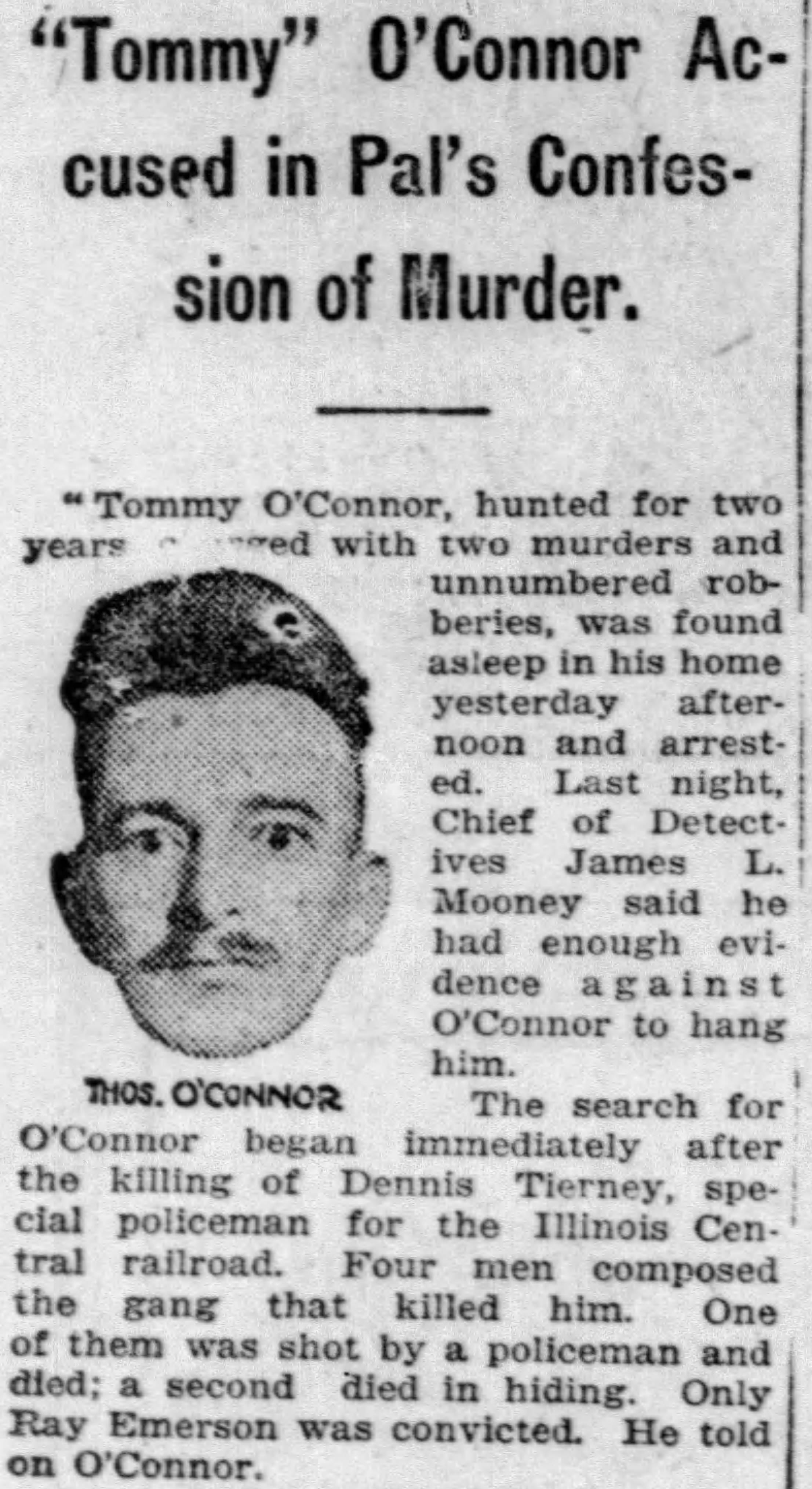 “Hunted 2 Years As Killer; Found In Home Asleep.” Chicago Tribune, 13 November 1919, https://www.newspapers.com/image/355084764/?match=1&terms=%20tommy%20o%27connor