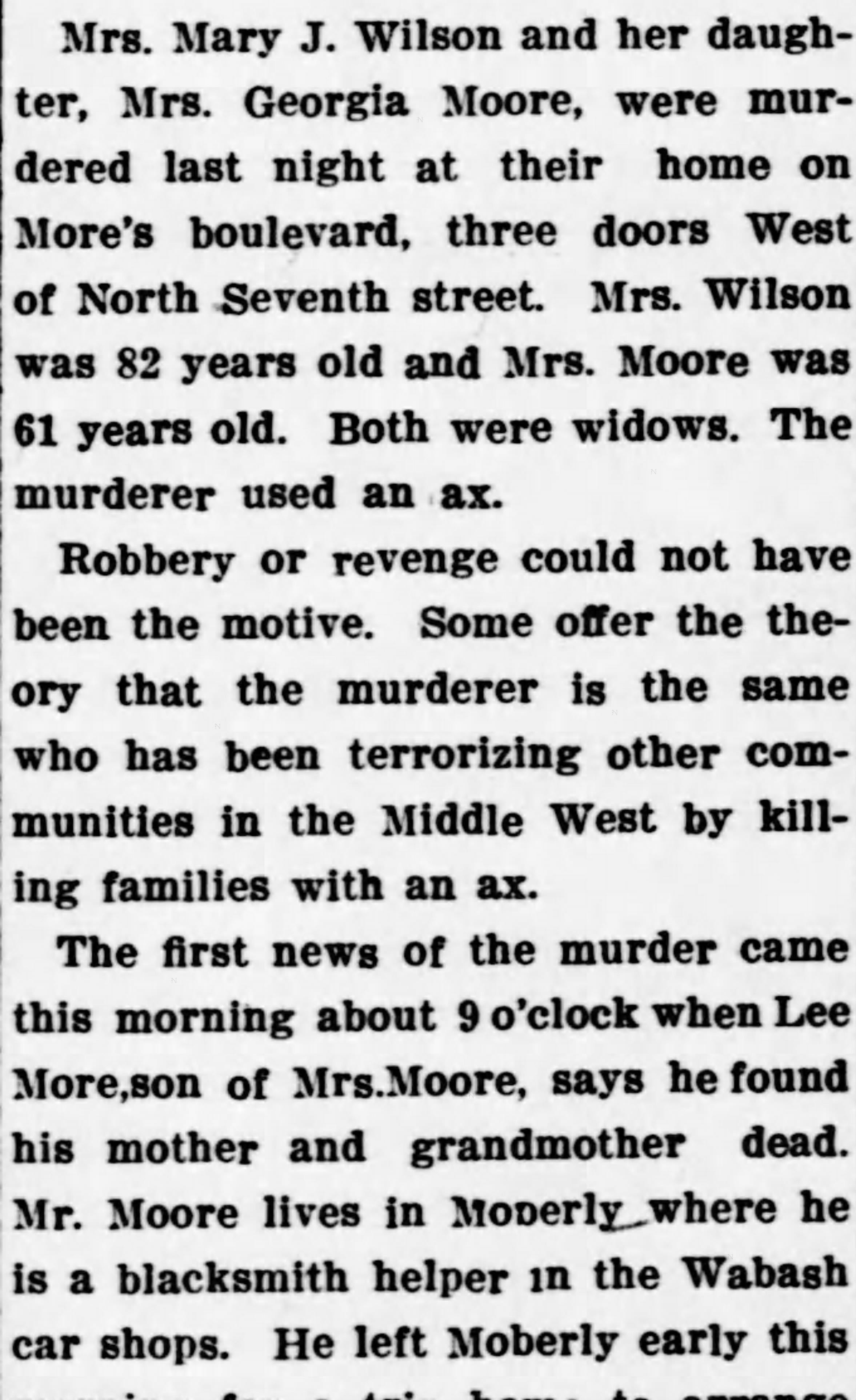 Dash, Mike, “The Ax Murderer Who Got Away”, June 8th 2012, https://www.smithsonianmag.com/history/the-ax-murderer-who-got-away-117037374/ Moberly Weekly, Monitor Moberly, Missouri, “1912 AX Murderer Henry Lee Moore killed Mom and Grandmother”, Tue, 31 Dec 1912
