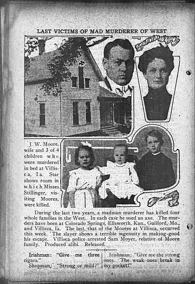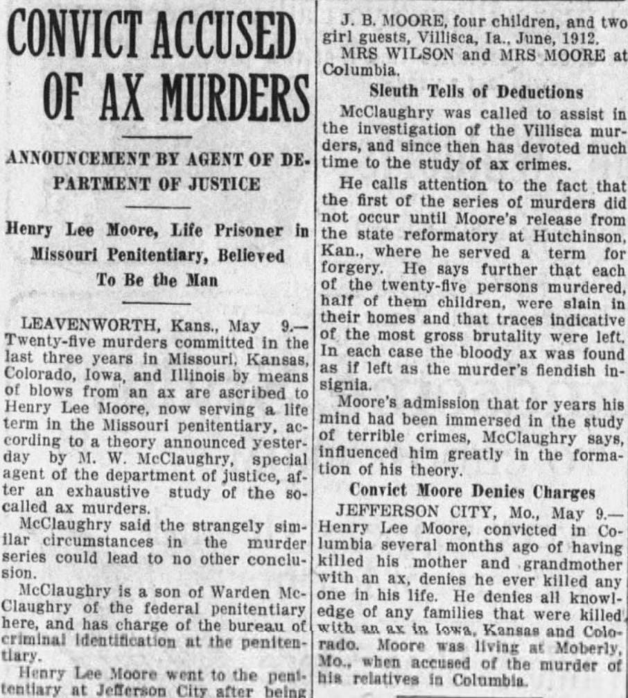 Henry Lee Moore was also suspected in what people had begun to assume was a spree of axe murders, including the Villisca murders, due to the timing of his release from prison in 1912 following his forgery conviction, which is about the time the spree is said to have begun, and then stopped not long after he was sentenced for the murders of his mother and grandmother.