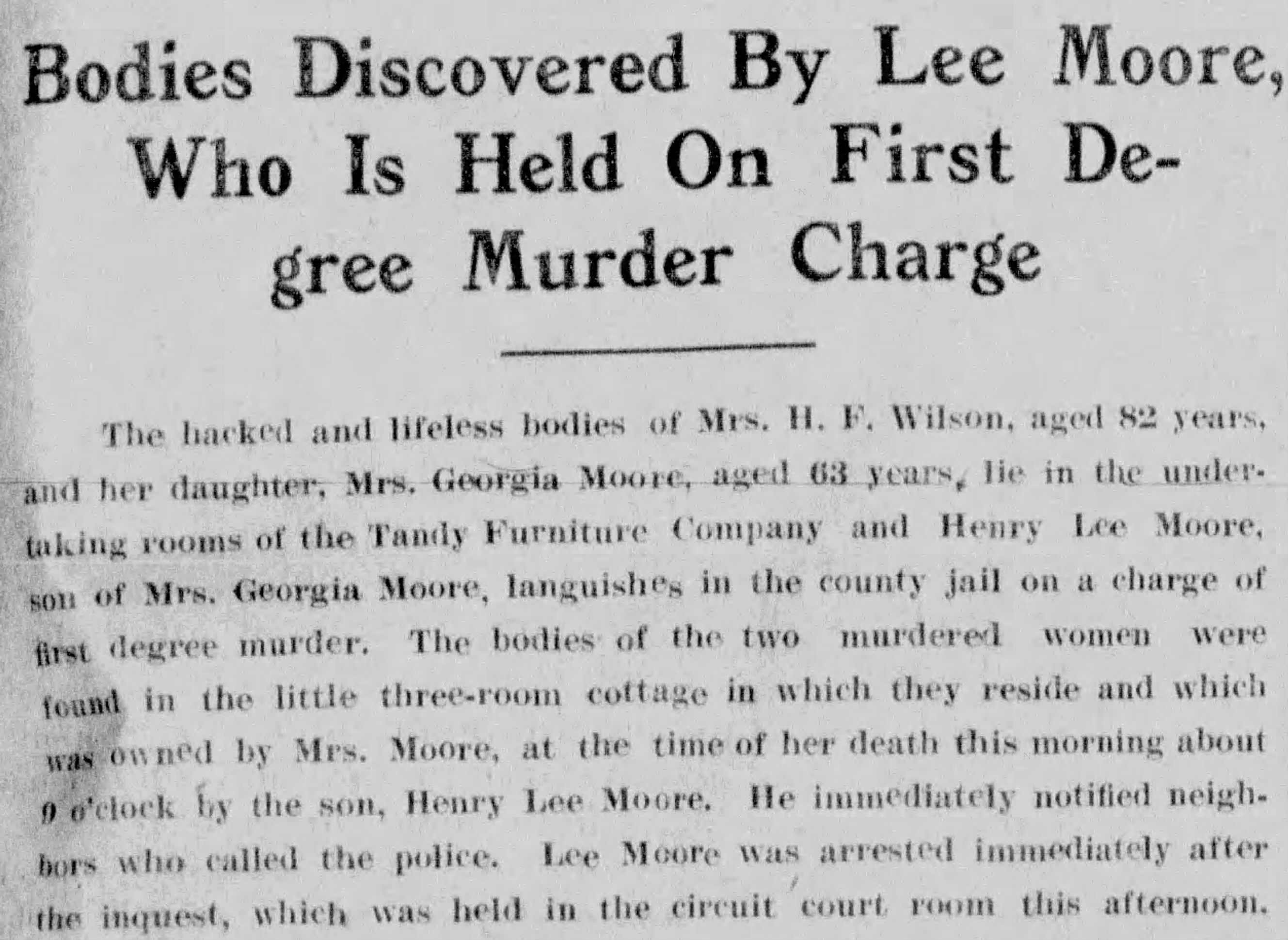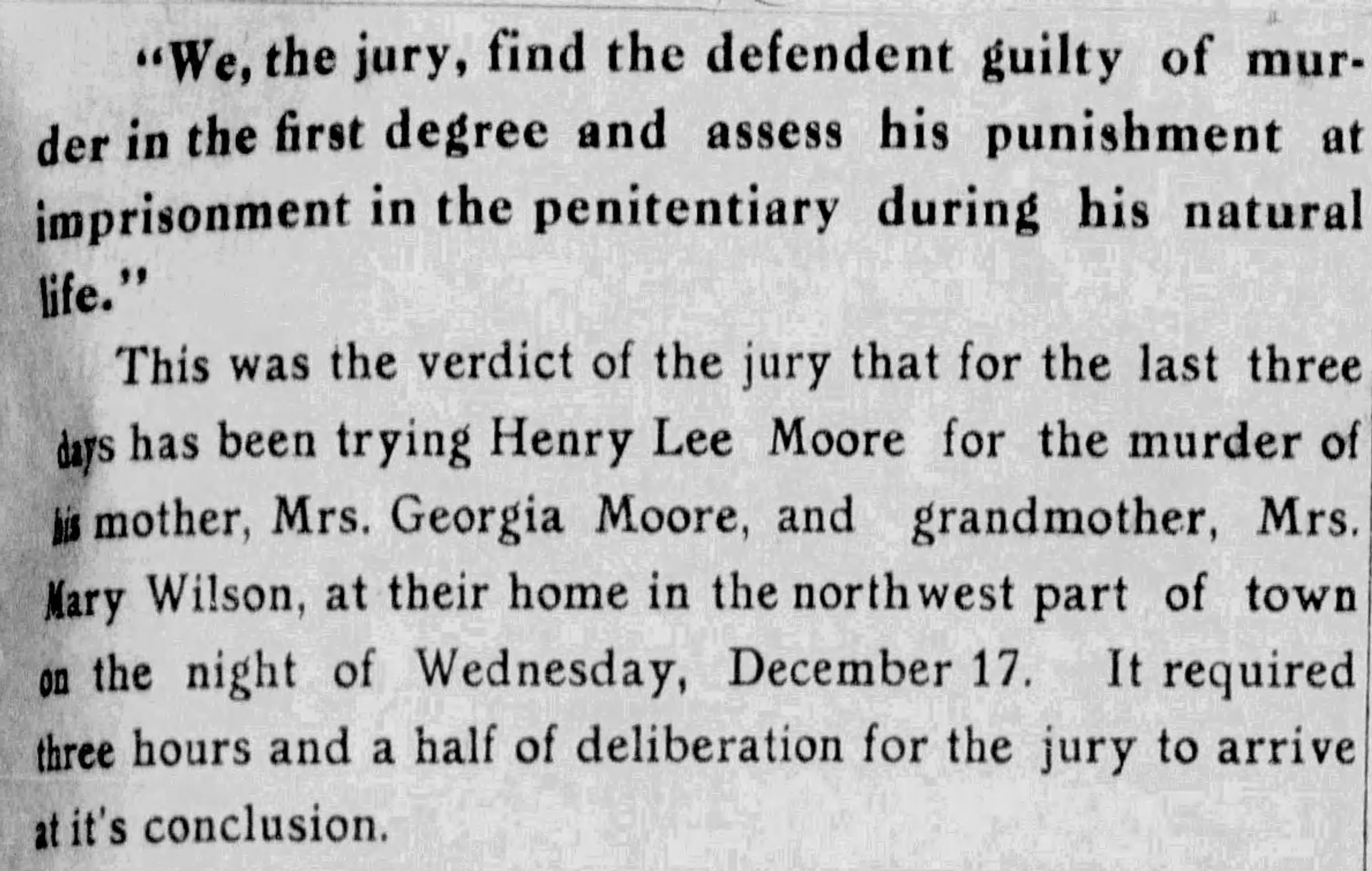 On March 14, 1913, After a 4-day trial, Henry Lee Moore was convicted of the first-degree murders of his mother and grandmother - a crime punishable by the death penalty, but the jury spared him, and instead, he was sentenced to life in prison.
