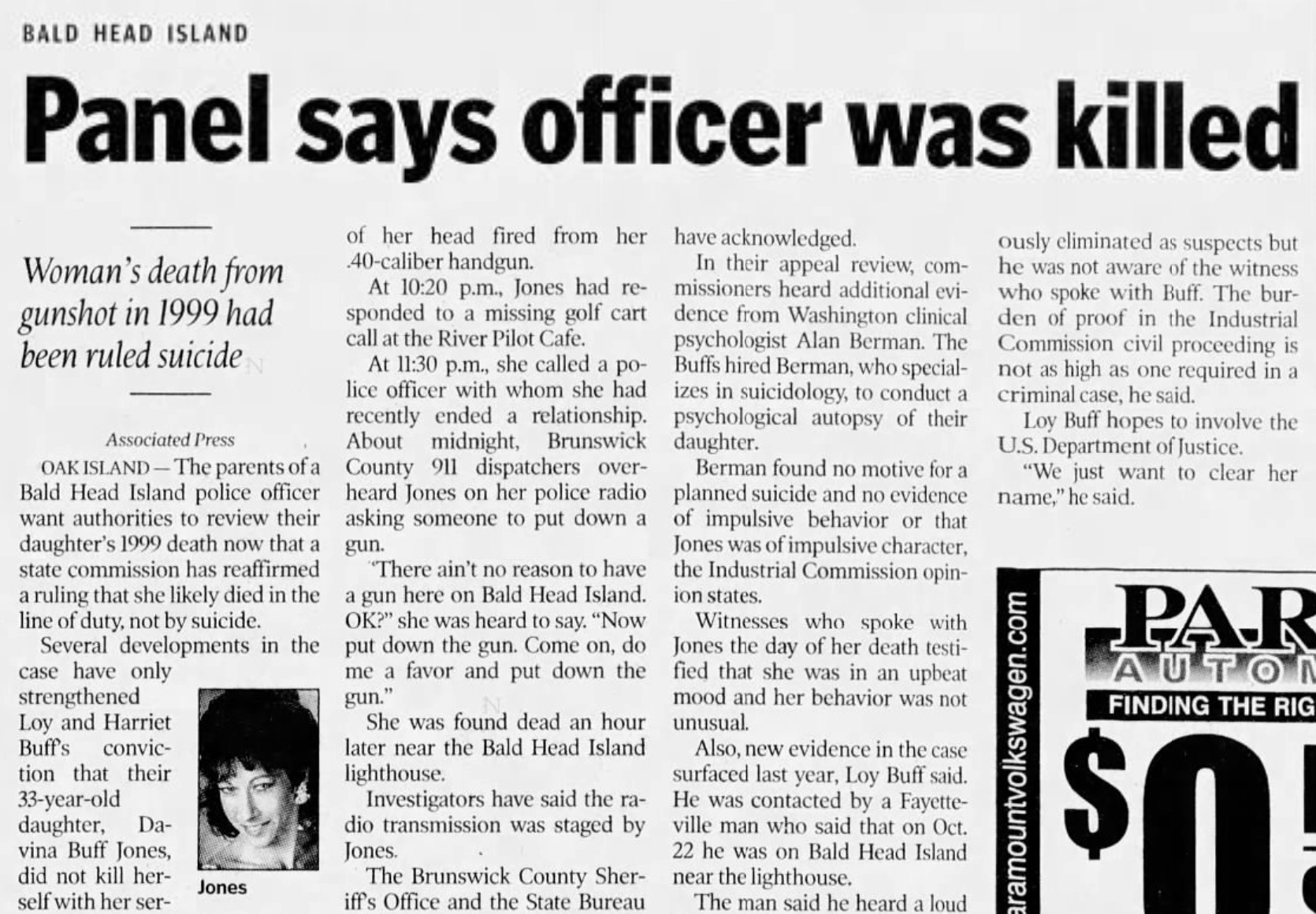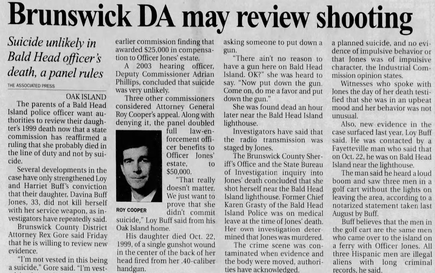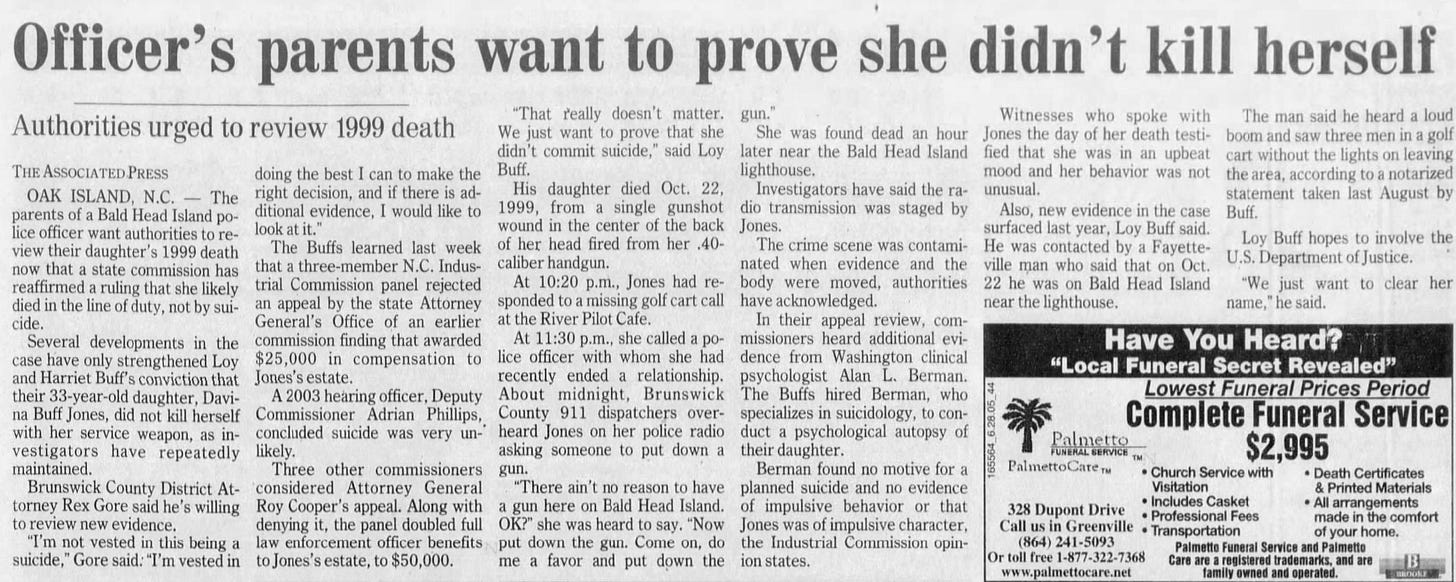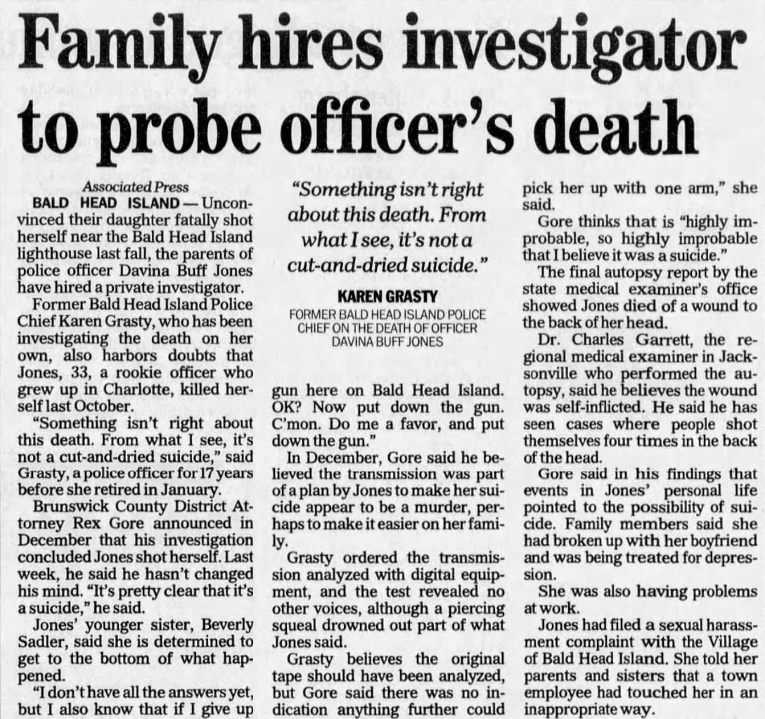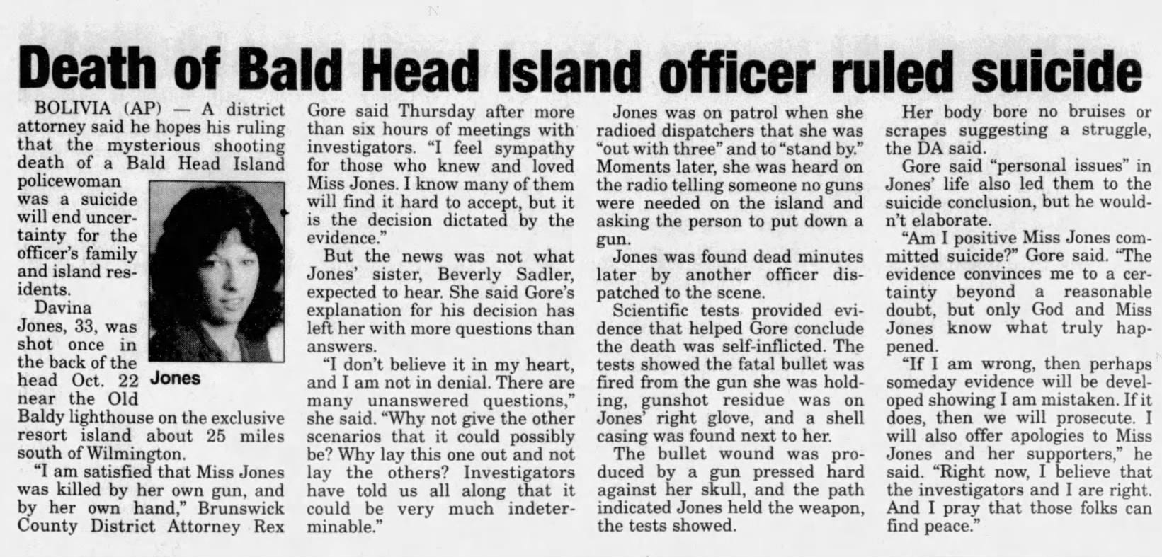 The Brunswick County Sheriff's Office and the State Bureau of Investigation were called in to investigate Davina Jones’ death, and within weeks, then-District Attorney Rex Gore announced a ruling: Davina had died by suicide.