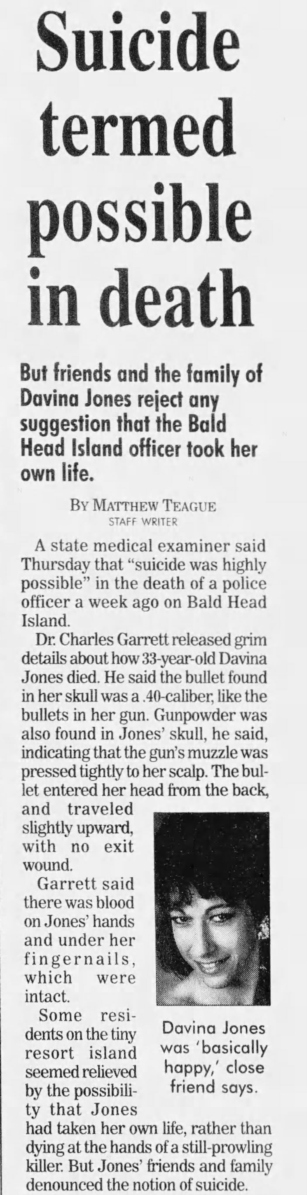 About 15 minutes later, Davina’s partner, Keith, arrived on scene. Davina was found lying on the ground with a single gunshot wound to the back of her head, with her service pistol nearby. Testing would confirm that the fatal shot had been fired from her gun.