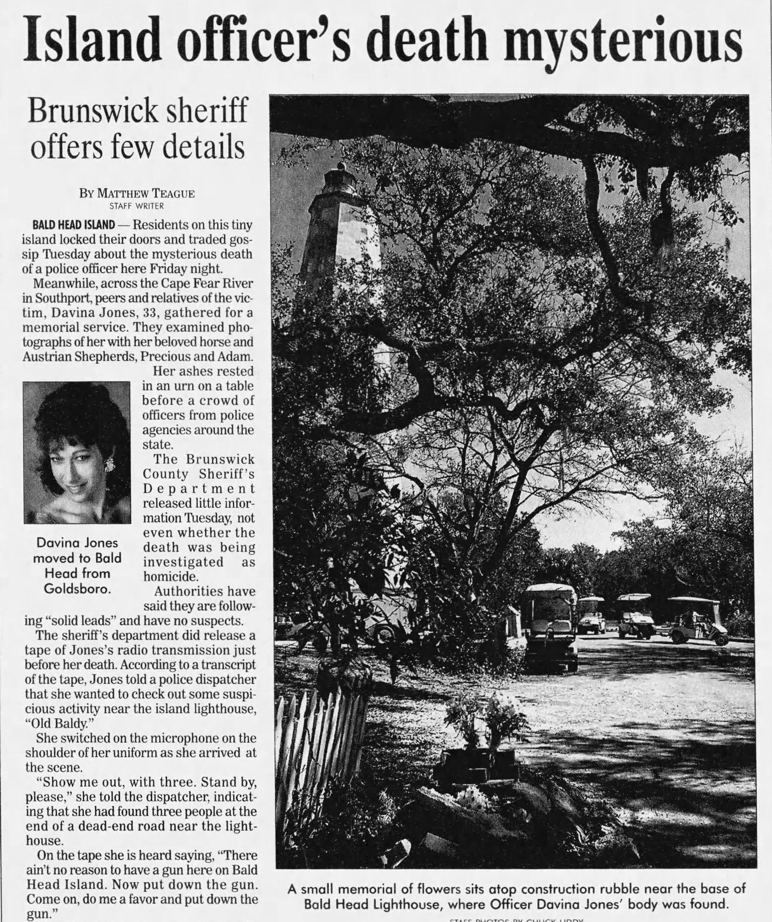 During her brief law enforcement career, 33-year-old Davina Jones, also known as ‘Dee,’ had patrolled Bald Head Island, North Carolina, without many incidents. Bald Head Island had few of the traditional dangers that define a police officer's life in the larger cities: no back-alley shootings, no gang conflicts, or midnight chases through the streets, but for its calm surface, the island certainly had its shady undercurrents.