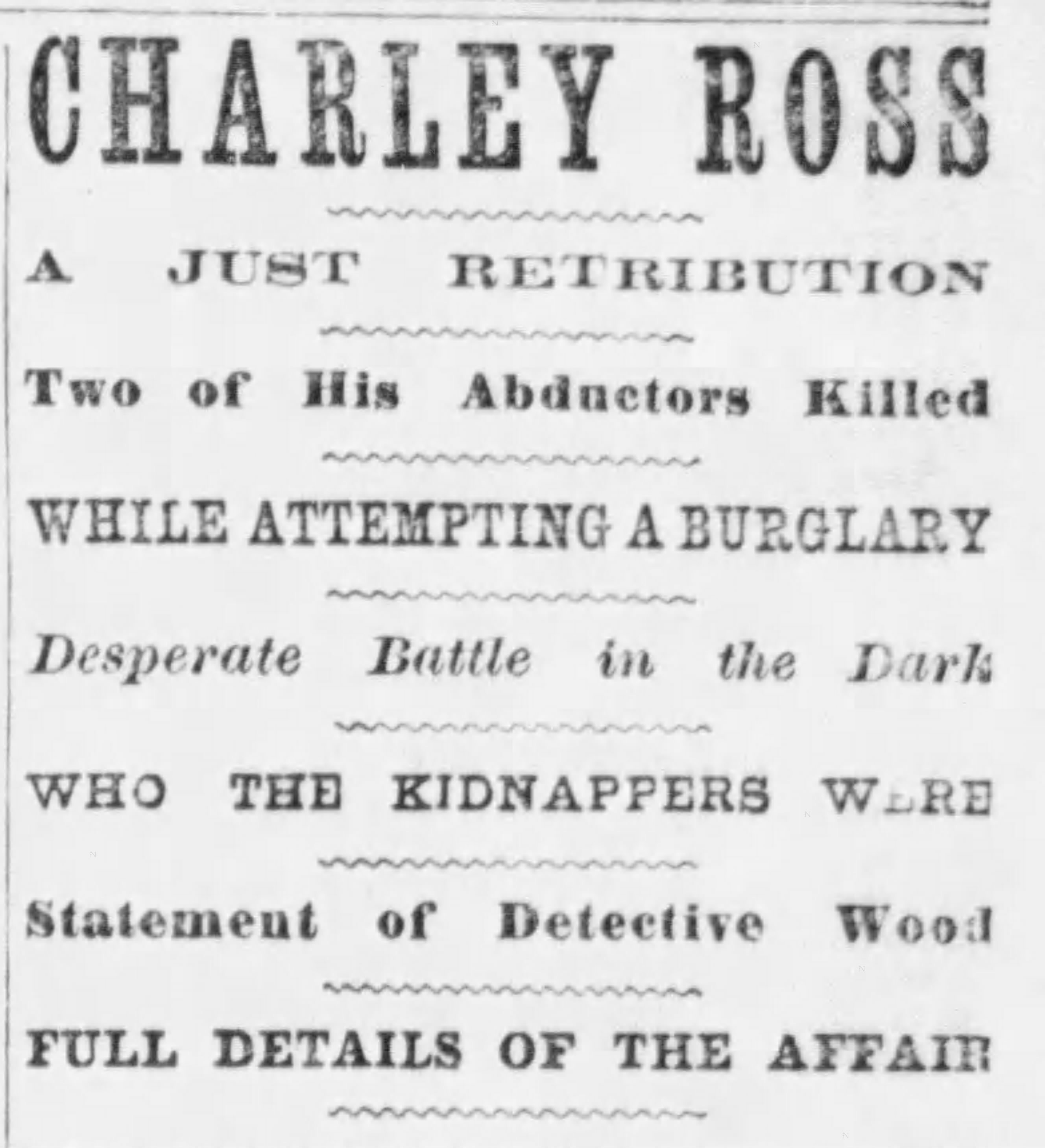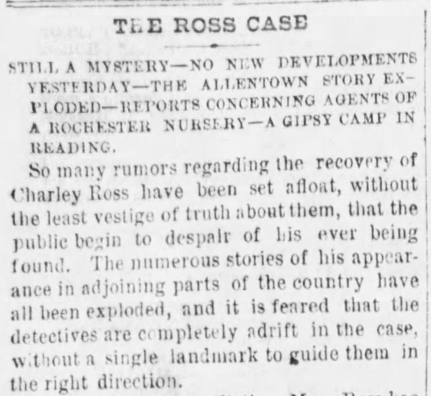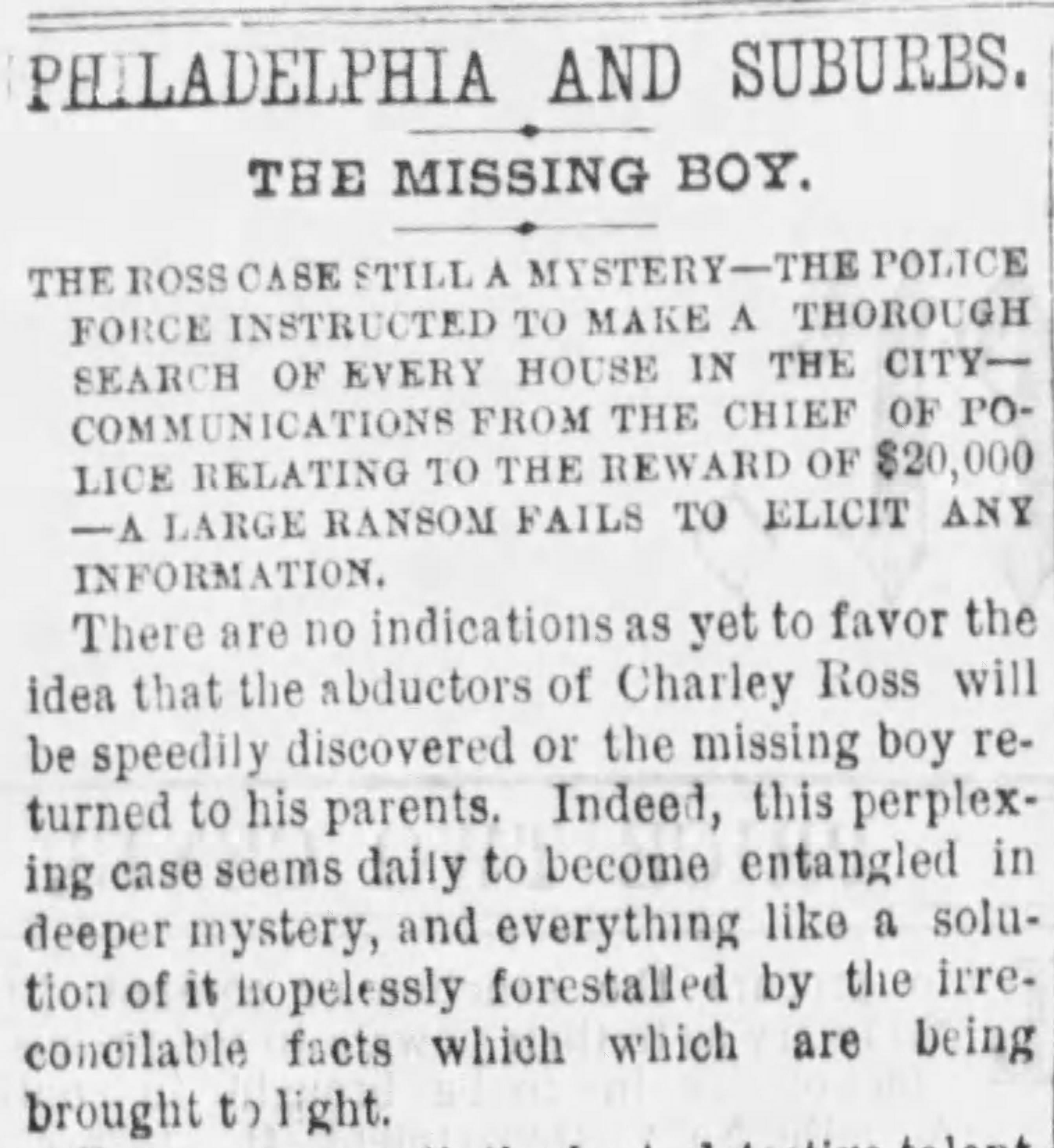 Over the next few days, people offered several theories about Charley’s abduction. One suggested that Mr. Ross himself had arranged the kidnapping for notoriety, although no one could say exactly why he would do such a thing. Christian Ross did his best to keep the tragic event from his wife, who was recuperating from an illness in Atlantic City. She would later learn the tragic tale when her husband began advertising in newspapers for the safe return of their son.