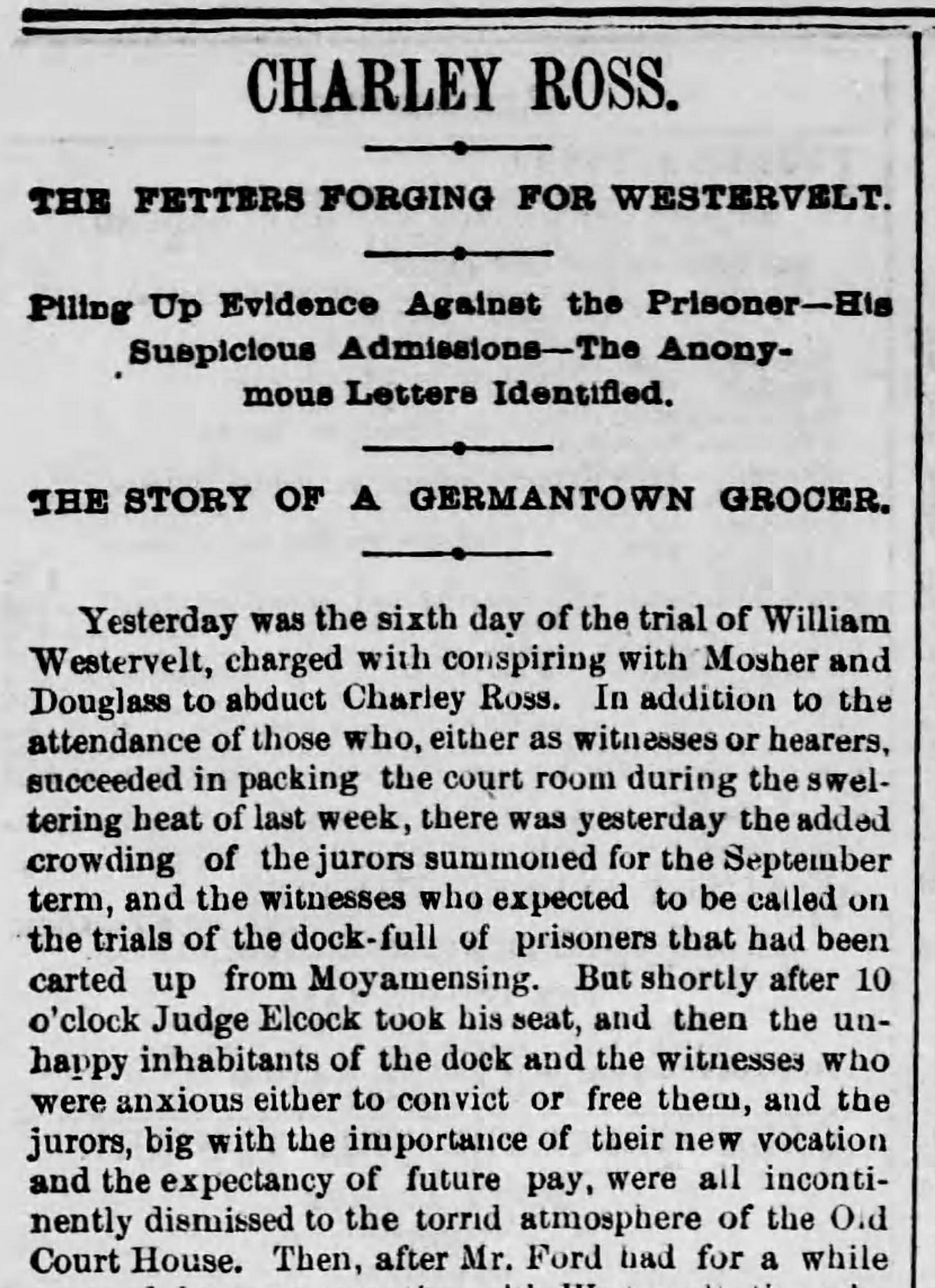 A former Philadelphia policeman, William Westervelt, was later arrested and held in connection with the case. He had been a friend and confidant of William Mosher. Hoping to find Charley, police charged Westervelt in 1875 and tried him for kidnapping.