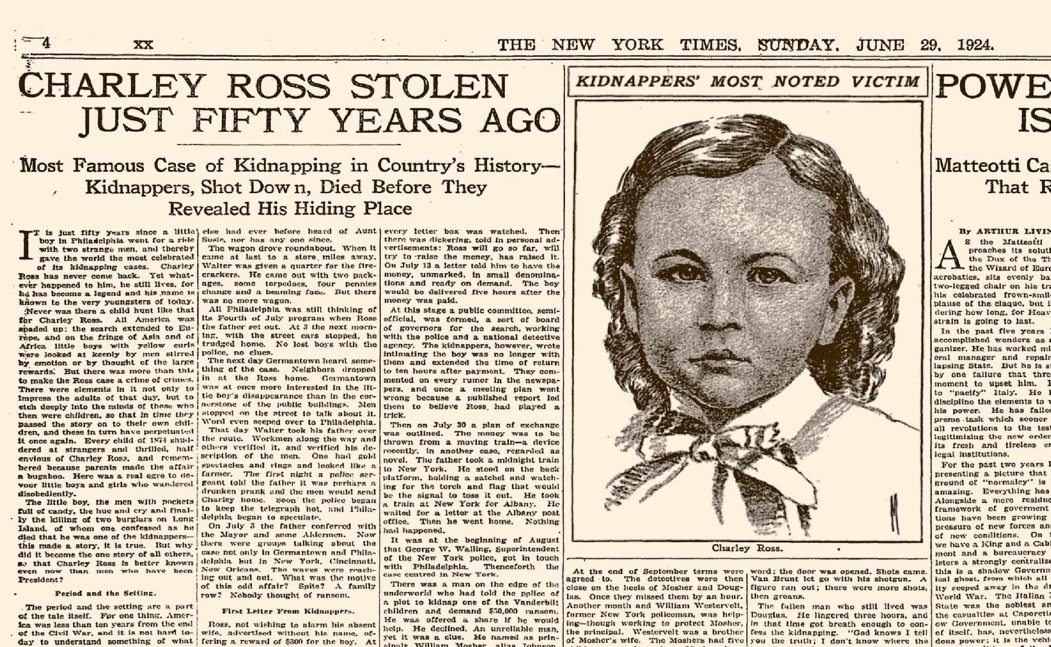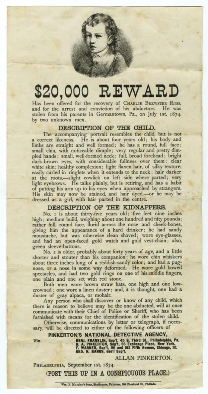 In July 1874, four-year-old Charley Ross was kidnapped from his Philadelphia neighborhood by two strangers. Despite the case's national notoriety, young Charley was never located