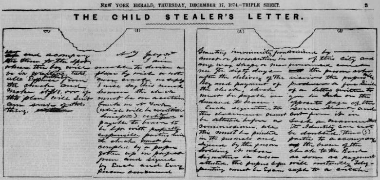 Two days later, on July 3, the first ransom note arrived. The first few ransom notes were mailed from post offices in Philadelphia and nearby towns. Each one was written in a semi-literate style, with many spelling errors and coarse language. The first note read as follows: