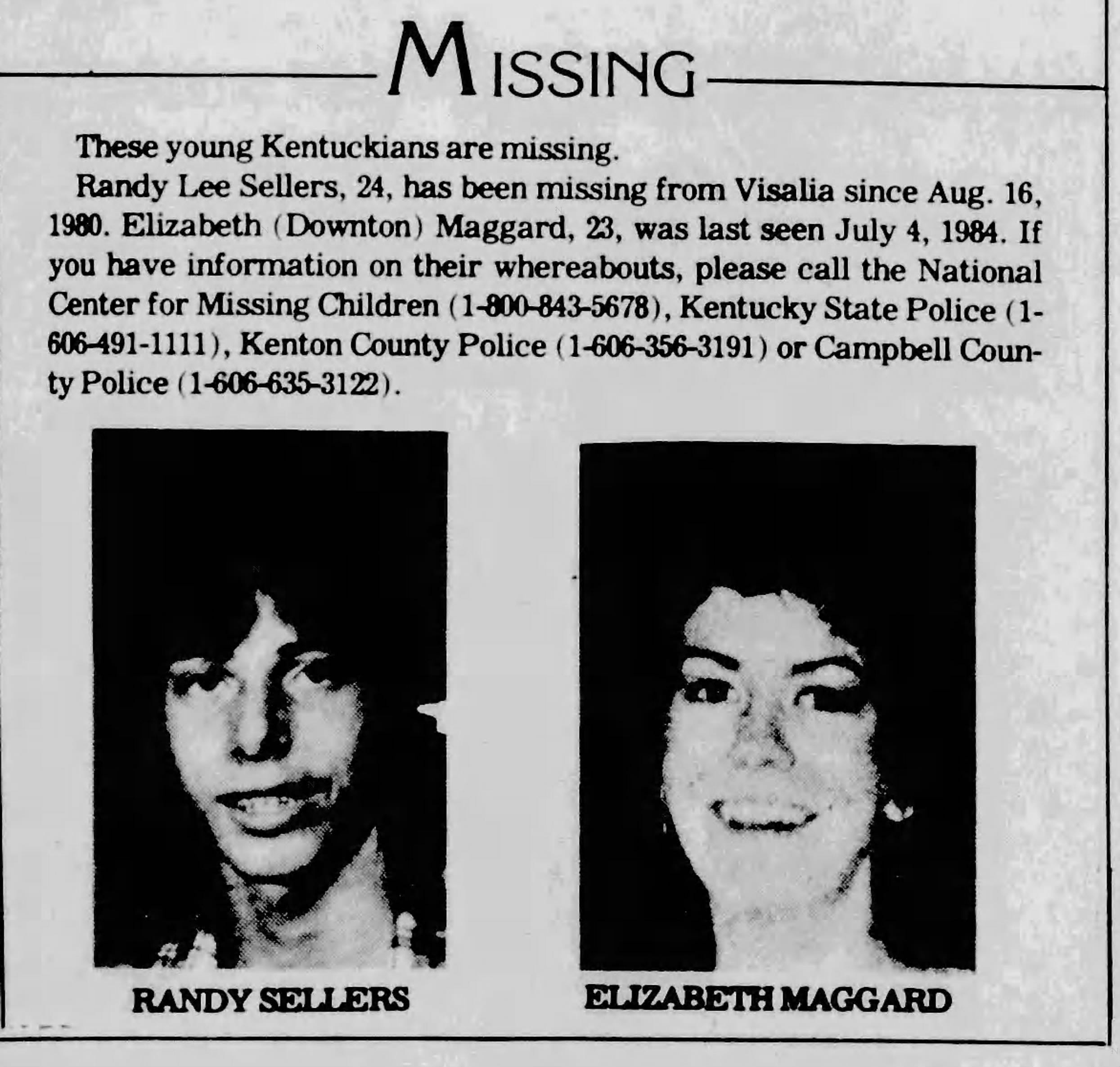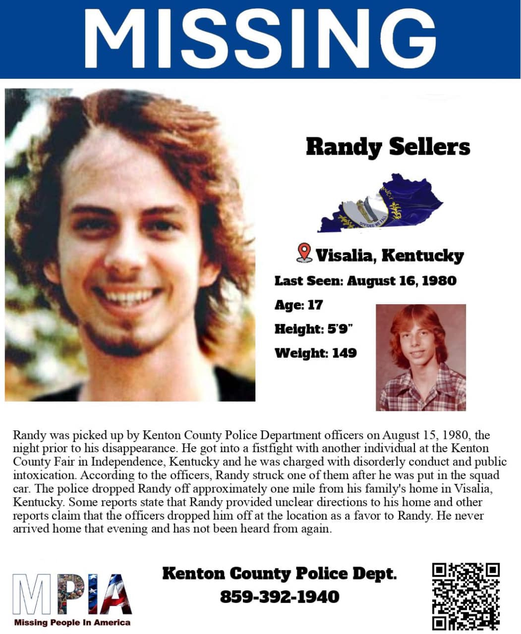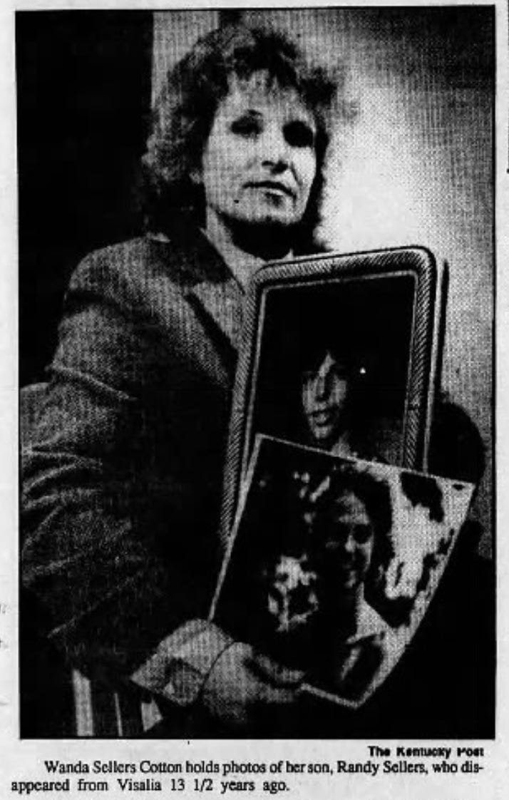 On August 16, 1980, 17-year-old Randy Sellers disappeared near his home in Visalia, Kentucky, just two weeks shy of his 18th birthday. There has been debate as to what may have happened to Randy that night. Two police officers picked Randy up at a nearby county fair for being intoxicated in public.