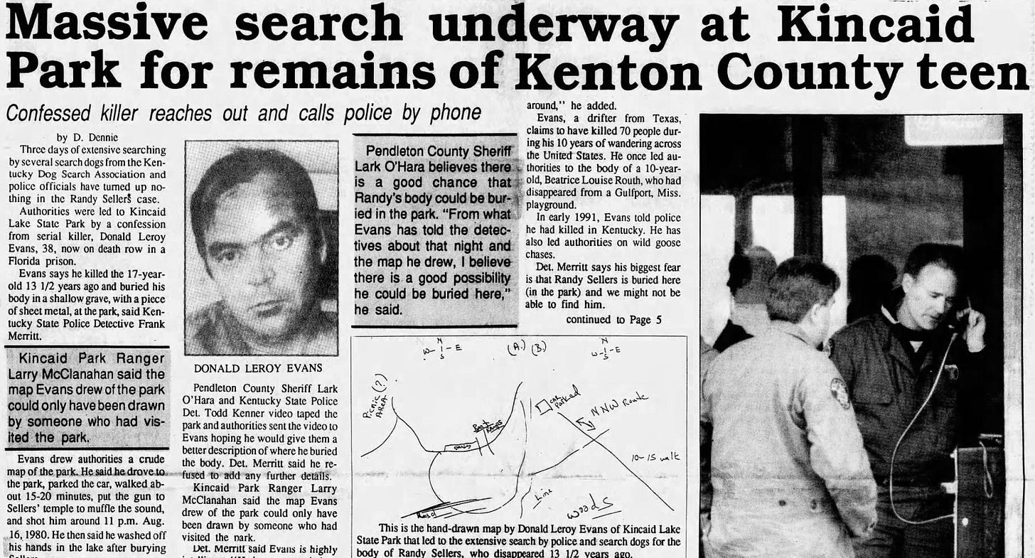 According to Evans, he picked up Randy after spotting him hitchhiking on Decoursey Pike near Randy’s home. After that, Evans drove them to Kincaid Lake State Park, where they shared beers and talked before Evans shot him in the back of the head and buried him in a shallow grave.