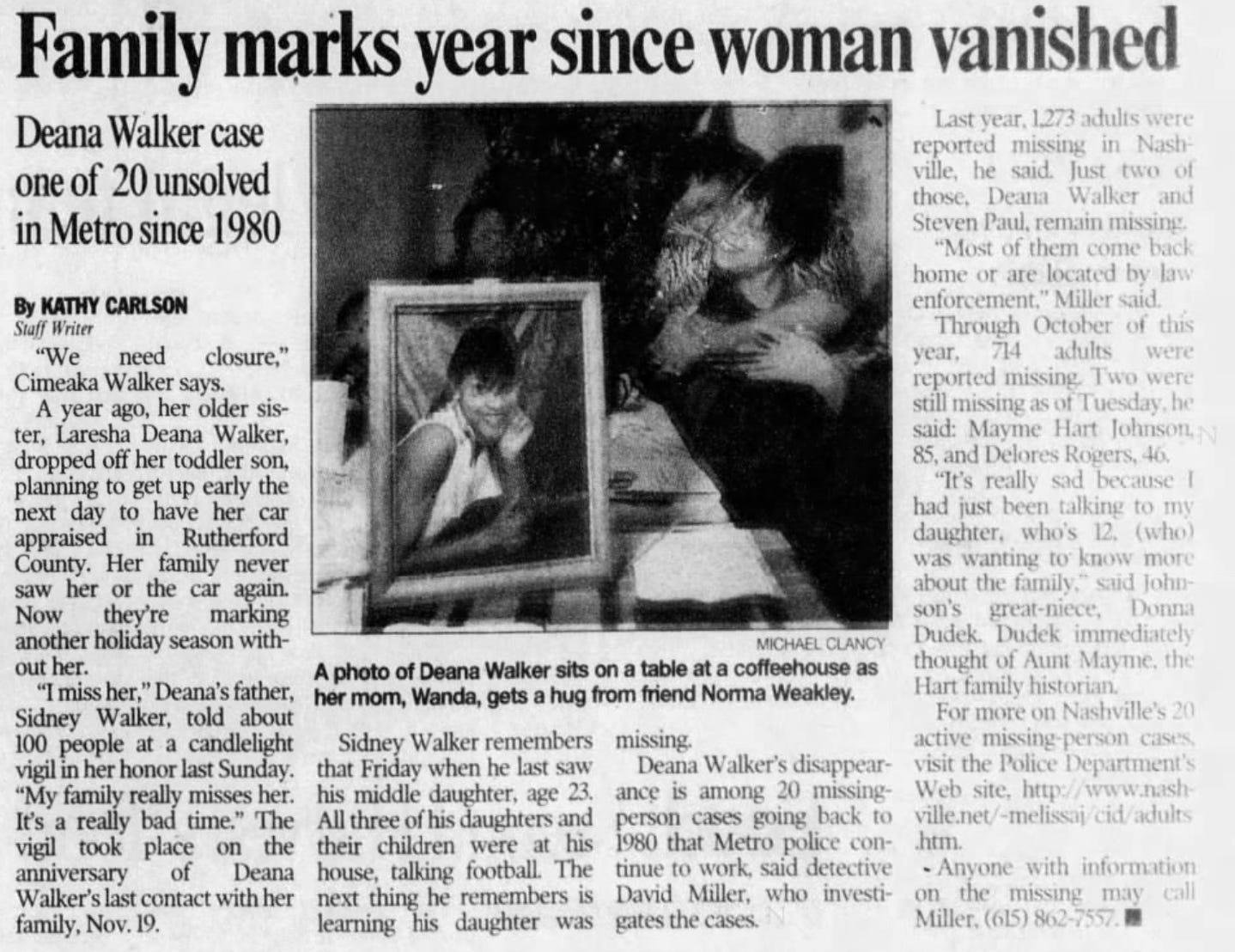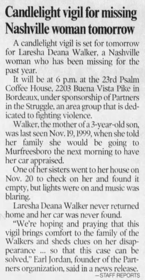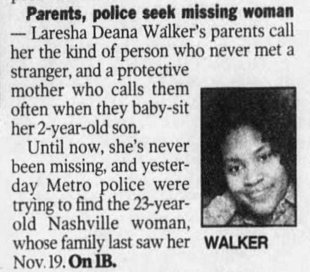 On November 19, 1999, Laresha Deana Walker dropped her two-year-old son at her sister’s house in Nashville and told her family she planned to have her car appraised the next morning in Murfreesboro.