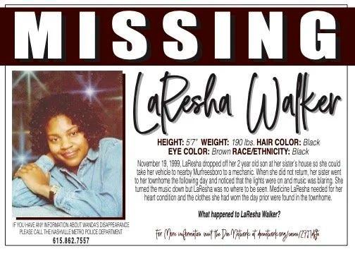 Laresha Deana Walker was born on January 2, 1976, and grew up in Nashville, Tennessee. At the time of her disappearance, in late 1999, she was a 23-year-old young mother.