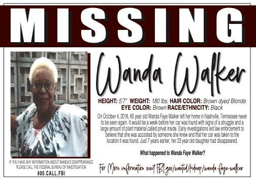Johnson, Constance. “Search Continues for Missing Nashville Grandmother, Five Years after Her Disappearance.” Oxygen, Oxygen, 20 Dec. 2023, https://www.oxygen.com/crime-news/fbi-nashville-police-continue-search-for-wanda-faye-walker