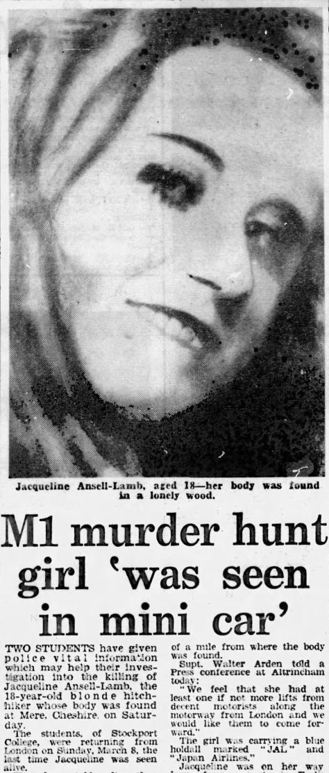 On March 14, 1970, the semi-nude body of a young woman was discovered by a farmer near Knutsford in Mere, Cheshire. The victim, later identified as 18-year-old Jacqueline Ansell-Lamb, had been raped and strangled with an electrical wire.