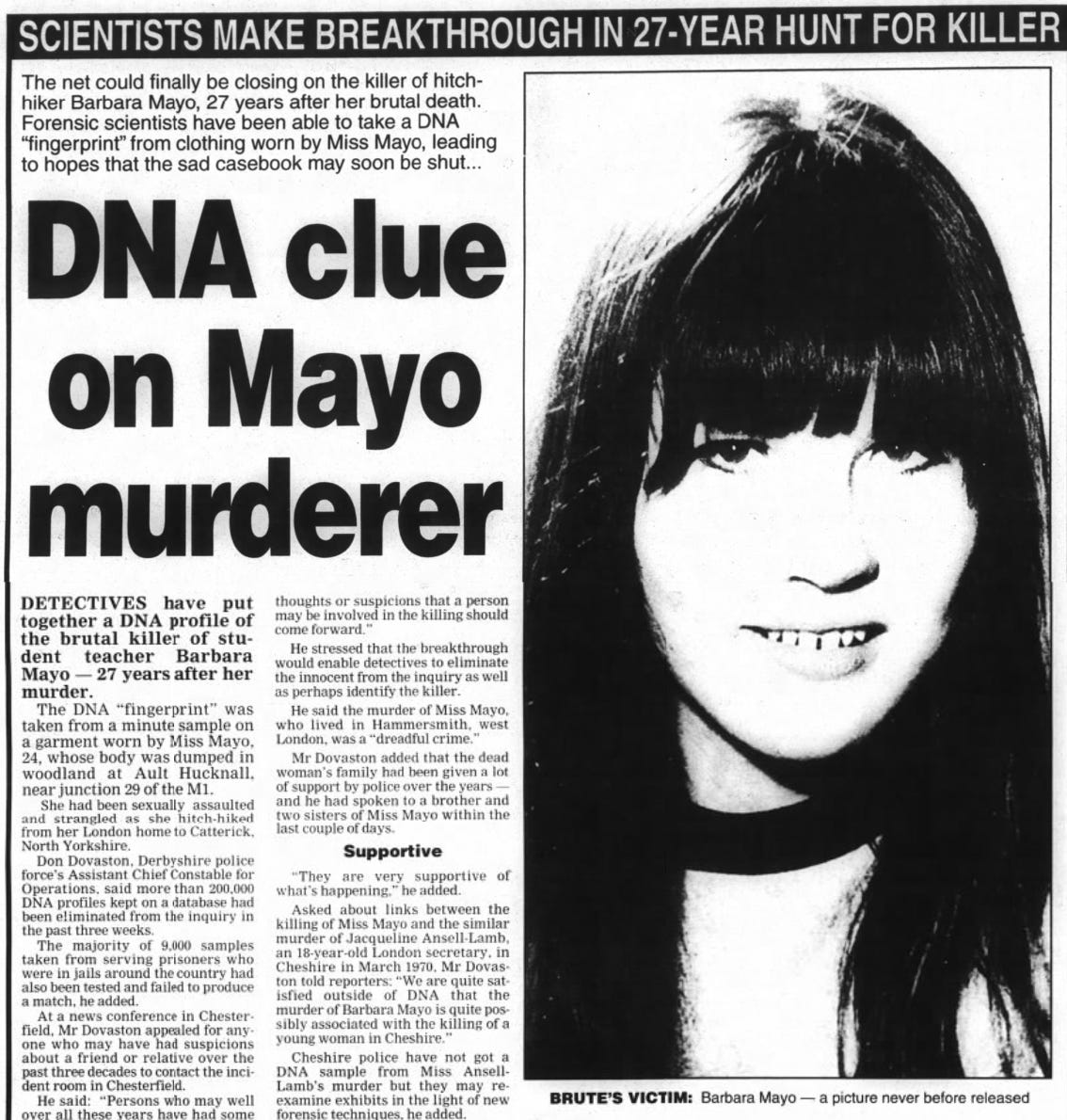 During the investigation, more than 120,000 people were interviewed by the police. Despite this massive effort, the killer of Barbara Mayo has never been identified.