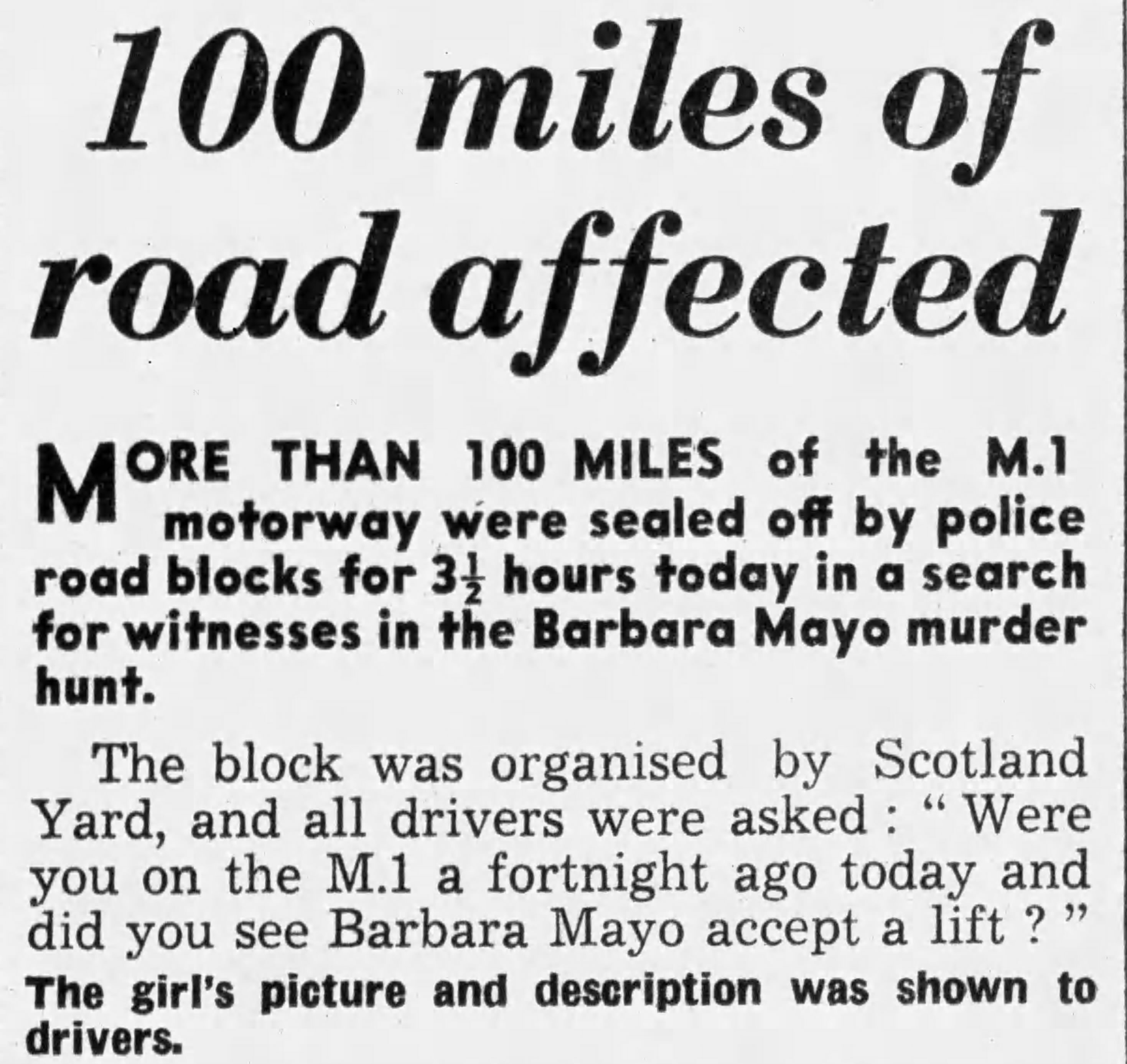 The investigation into Barbara Mayo’s death became one of the largest in England’s history. Chief Superintendent Charlie Palmer of Scotland Yard was brought in to assist in the investigation. On the morning of October 26, in an unprecedented move, Palmer ordered every vehicle at all junctions along a 150-mile stretch of the M1 motorway to be stopped and checked.