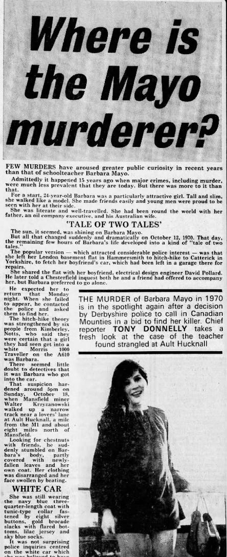 Seven months later, on October 18, the body of another young woman was found in a wooded area at Ault Hucknall, Derbyshire. She, too, had been raped and strangled. The victim was identified as 24-year-old Barbara Mayo, who had been missing since October 12th.