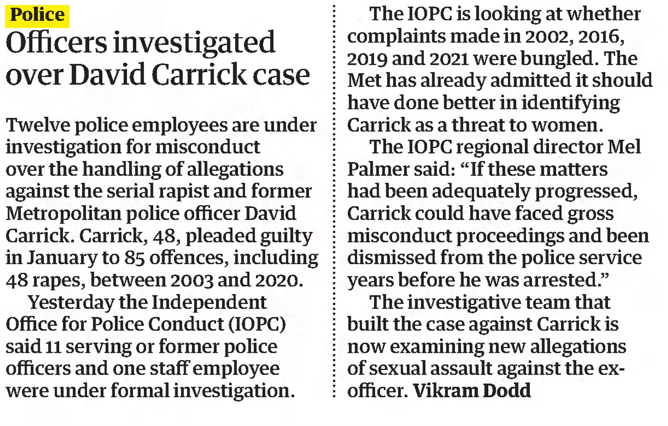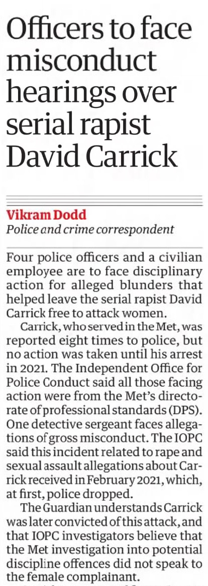 Vikram, Dodd. “Four Officers Face Disciplinary Action over David Carrick Investigation.” The Guardian, Guardian News and Media, 30 Sept. 2024, www.theguardian.com/uk-news/2024/sep/30/four-officers-face-disciplinary-action-over-david-carrick-investigation.