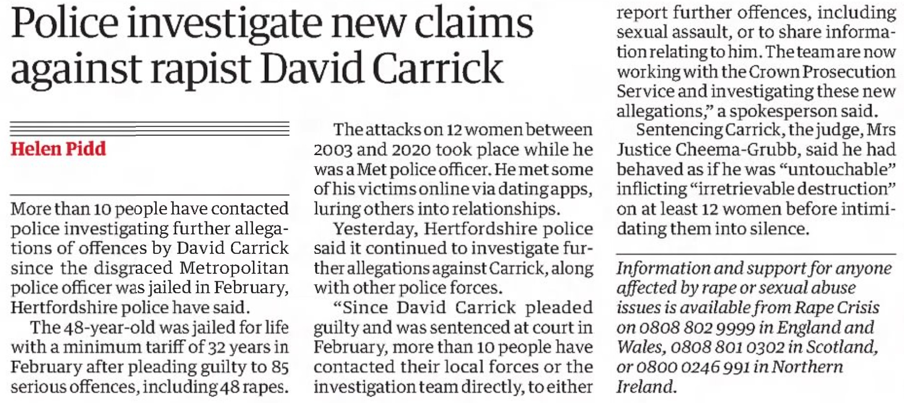 “Officers Face Action for ‘failures’ over Serial Rapist David Carrick.” ITV News, 30 Sept. 2024, www.itv.com/news/anglia/2024-09-30/officers-face-action-for-failures-over-serial-rapist-david-carrick.