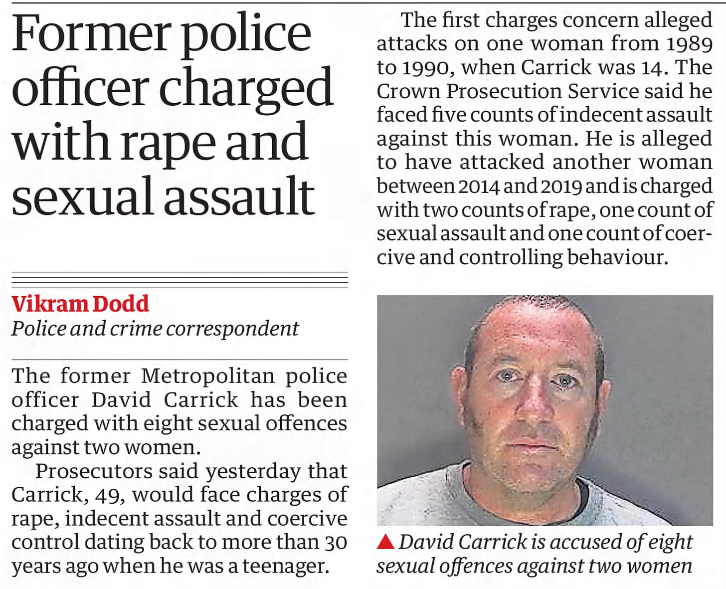 In 2002, A former partner accused Carrick of harassment and assault when he was still a probationary constable. He was questioned by his line manager, but no referral was made to the Met’s Department of Professional Standards (DPS), a major breach of internal procedure.