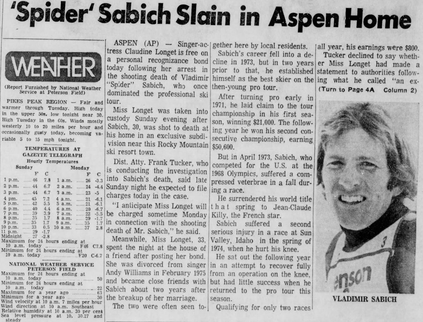 Unfortunately, beginning in 1973, a series of injuries slowed Sabich’s career, forcing him to miss the entire 1975 season. During this time, Claudine Longet was splitting time between her home in Malibu and Sabich’s Aspen chalet in the exclusive Starwood complex, where he was neighbors with singer John Denver.